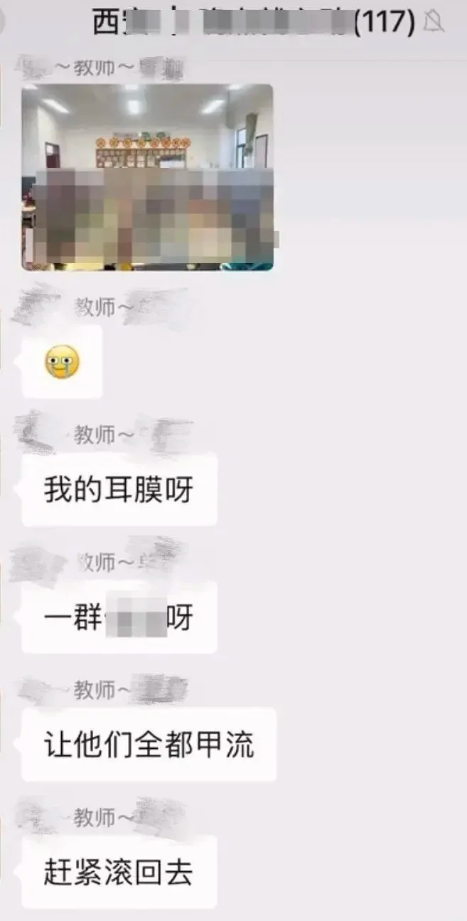 聊天记录显示,在百余人的微信群聊中,一个疑似教师身份的微信用户发布了孩子在课堂上的照片,附文称“我的耳膜呀,一群XX,让他们全都甲流,赶紧滚回去”。其表示“这都乱成啥了,我就不管”“工资到手就行”。