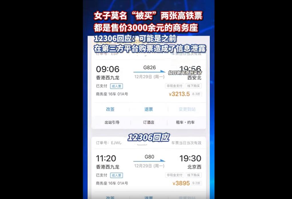 河北杨女士 12306 账户突现两张香港西九龙出发的高价商务座票,非本人购买,支
