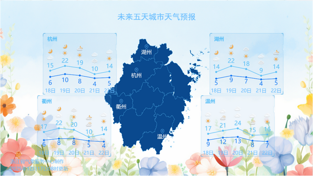 其中明天早晨最低温度:东南沿海地区8-10℃;山区1-3℃,有霜;其他地区4-6℃。明天白天最高温度:浙北地区15-17℃;其他地区18-20℃。