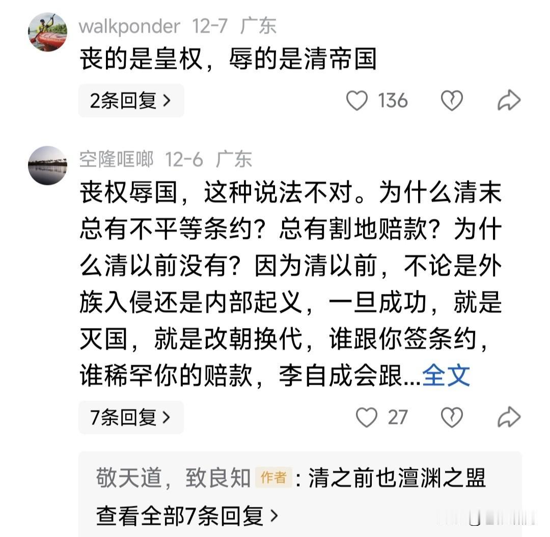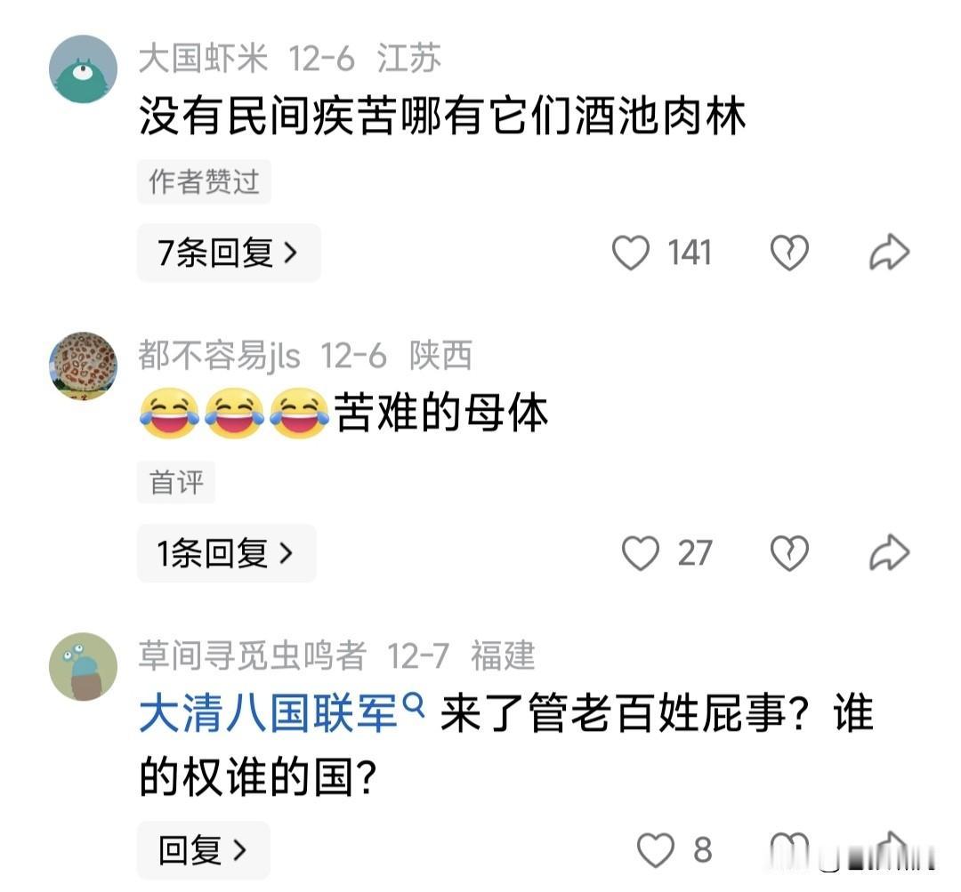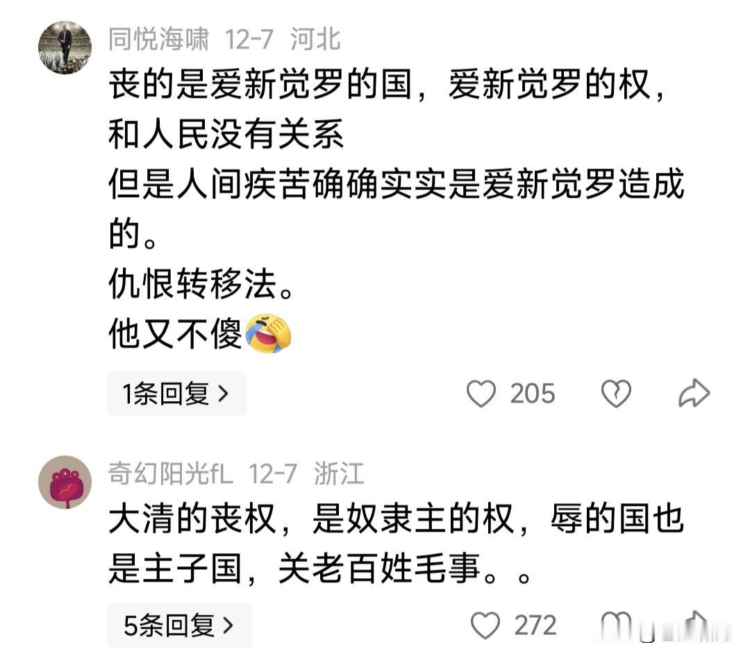 网友提问题,让人振聋发聩,醍醐灌顶:大清朝天天说丧权辱国,从来不提民间疾苦!你知道为什么吗? 评论留言令人眼界大开,幡然醒悟: 丧谁的权?辱谁的国?中国历史没有人民的国,只有皇帝老子的国! 大清的丧权,是奴隶主的权!辱的国也是主子的国,不是老百姓的国!丧的是王权利益,辱的是朝廷排面! 丧的是爱新觉罗的权,辱的是爱新觉罗的国,和老百姓无毛线关系!清朝的社会疾苦就是爱新觉罗造成的! 还有网友贴出“李鸿章全集.电稿”,列出清政府官员,不让洋行给中国工人高工资,若给即重税的剥夺行为。 以上所列,让人想起商鞅和韩非子“驭民术”:国富而贫治,不能让百姓有钱;民愚则易制,不能开启民智! 如此等等,说明历朝历代的封建帝王,从没把百姓当“人”看!在他们眼里,百姓只是臣民顺民,养活他们奢华生活的奴隶,维护帝王权利的工具! 这种情况,一直延续到孙中山领导辛亥革命,推翻封建帝制!毛泽东建立新中国,人民当家做主人!邓小平领导改革开放,让中国走上发展轨道! 我们曾认为商鞅和韩非子,是历史上的“改革家”!看来并非如此,因为他们的改革,是为帝王朝廷,不是为老百姓;是让“国富民穷”,便于管制! 中国历史上最伟大改革家是邓小平!他领导我们拨乱反正,改革开放,依法治国发展经济,是为了民富国强,让人民摆脱贫穷,过上小康生活! …………