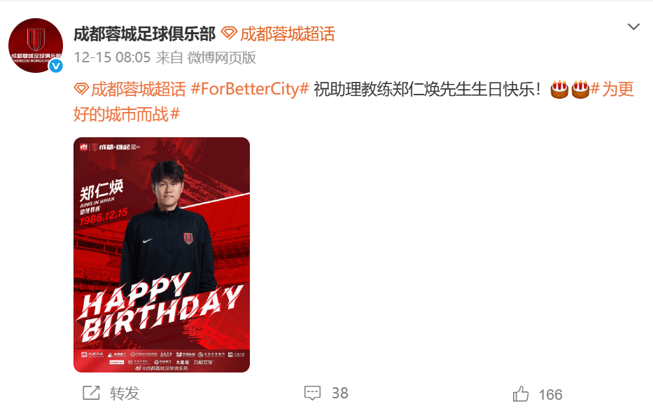 而就在2天之前,成都蓉城曾在当天早上8点发布动态,为助理教练郑仁焕送上生日祝福。