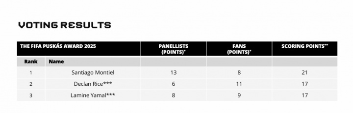 根据国际足联官方公布的票数统计结果,蒙铁尔以21分位列第一,赖斯和亚马尔同积17分分列二三,官方仅给出了前三名的投票结果。