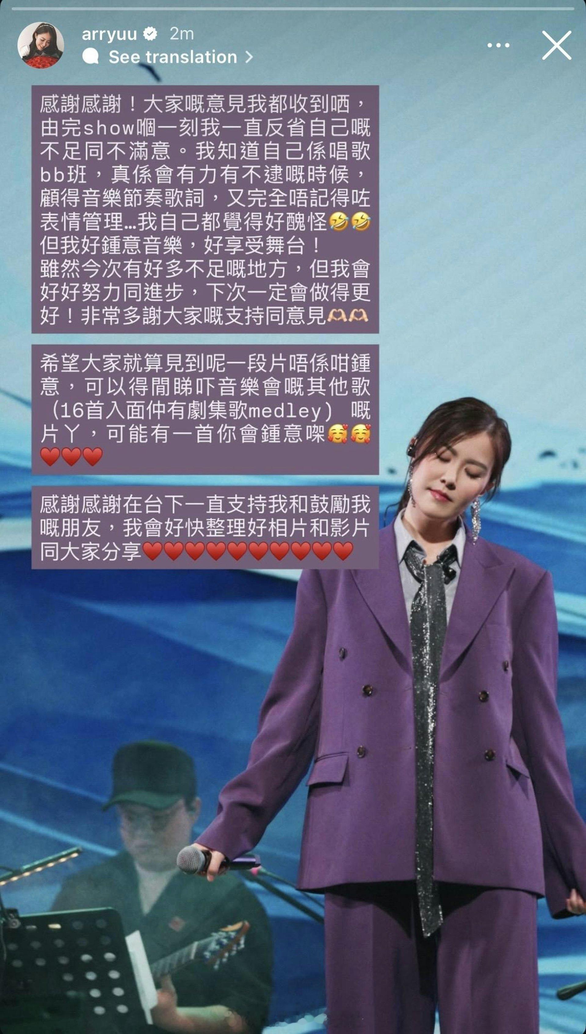 香港01:刘佩玥谦虚回应唱歌面目狰狞 认忘记表情管理:我都觉得好丑怪刘佩玥一向热爱唱歌,除了参加《中年好声音4》艺员赛区外,她近日在广州举行首个个人音乐会,不过她献唱Beyond名曲《海阔天空》的表情,就被指十分狰狞;加上她身穿紫色西装外套,顿变“Joker”。网民狠批她“用虎纹唱歌”、“五官肌肉不协调”,更质疑她样貌变“胶”。惨遭负评的刘佩玥今日(17日)在社交平台虚心回应,她表示有收到大家意见,由完骚当刻已一直反省自己不足,并承认:“我知道自己是唱歌bb班,真是会有力有不逮的时候,顾得音乐节奏歌词,又完全忘记了表情管理…我自己都觉得好丑怪。但我好钟意音乐,好享受舞台 !”她指自己今次确有不足,但会好好努力和进步,承诺下次会做得更好,也感谢大家的意见。她续说:“希望大家就算见到这一段片不是这么钟意,可以得闲睇吓音乐会的其他歌(16首入面仲有剧集歌medley〕的片丫,可能有一首你会钟意㗎。🥰🥰♥️♥️♥️”