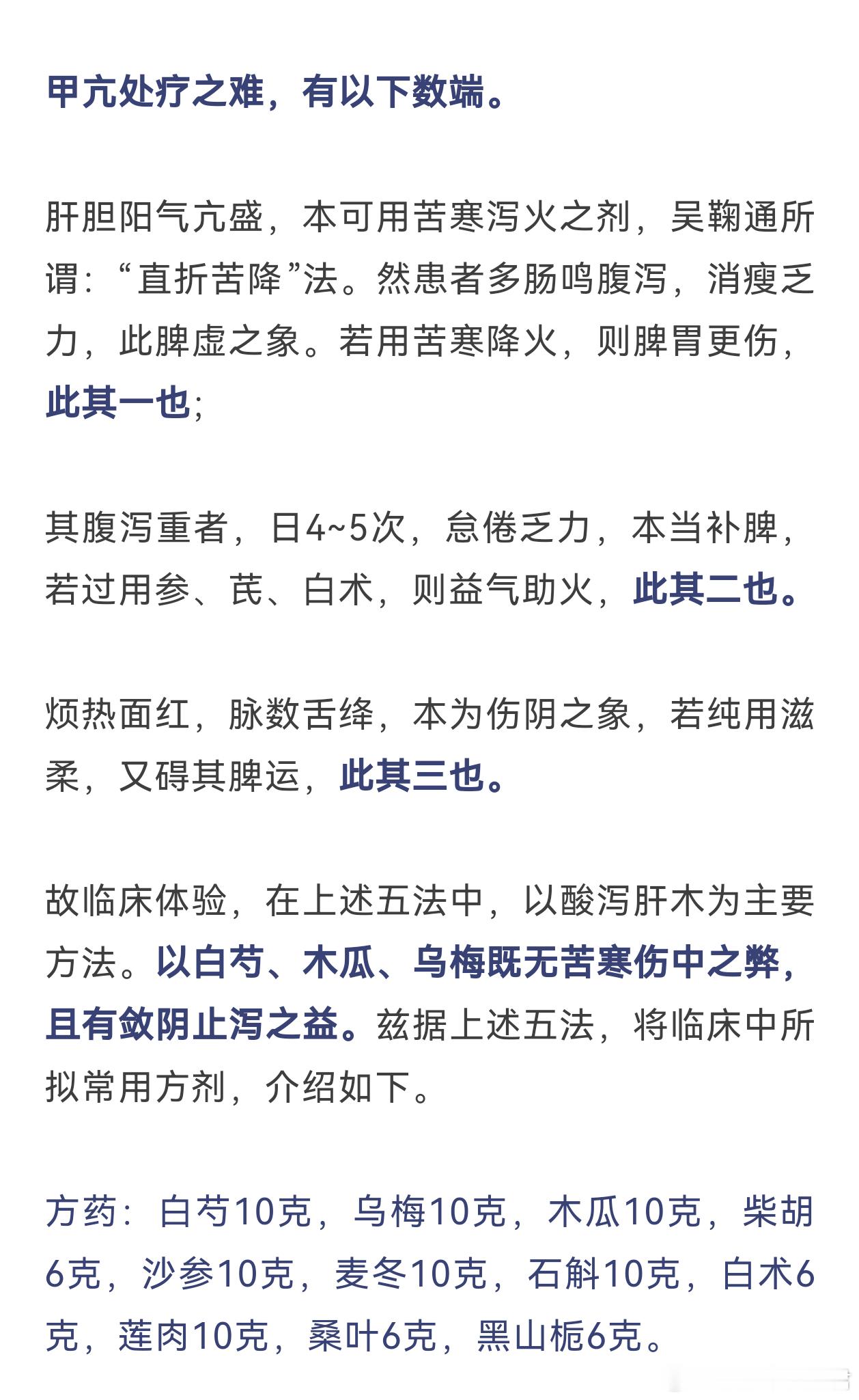 甲亢属于难治病,西医需要长期服药、疗程长且易复发。中医涉及多个脏,病机互相矛盾,常见的处方偏性大、多用毒药,无法推广和长期服用。下午我看到天津医科大学总医院中医科王士相教授论治甲亢病机以及自拟的甲亢煎,深感钦佩,分享之——白芍10克,乌梅10克,木瓜10克,柴胡6克,沙参10克,麦冬10克,石斛10克,白术6克,莲肉10克,桑叶6克,黑山栀6克这个方子平和安全,很多是药食同源,王士相教授说大多数甲亢患者服用1月左右即能改善症状,后续可做成丸,连服4-6月以资巩固王教授分析了甲亢治疗的难点:清肝则碍脾,补脾则助火,滋阴则不运,甲亢煎规避了这三大弊端,所以可以久服,逐渐取效