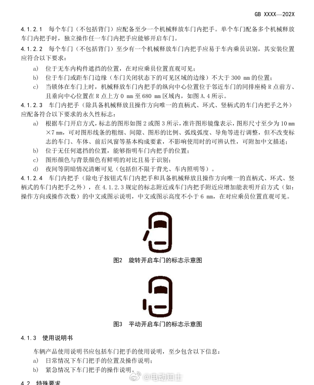 工信部公开征求车门把手等7项强制性国家标准意见,要求每个车门应配备机械...
