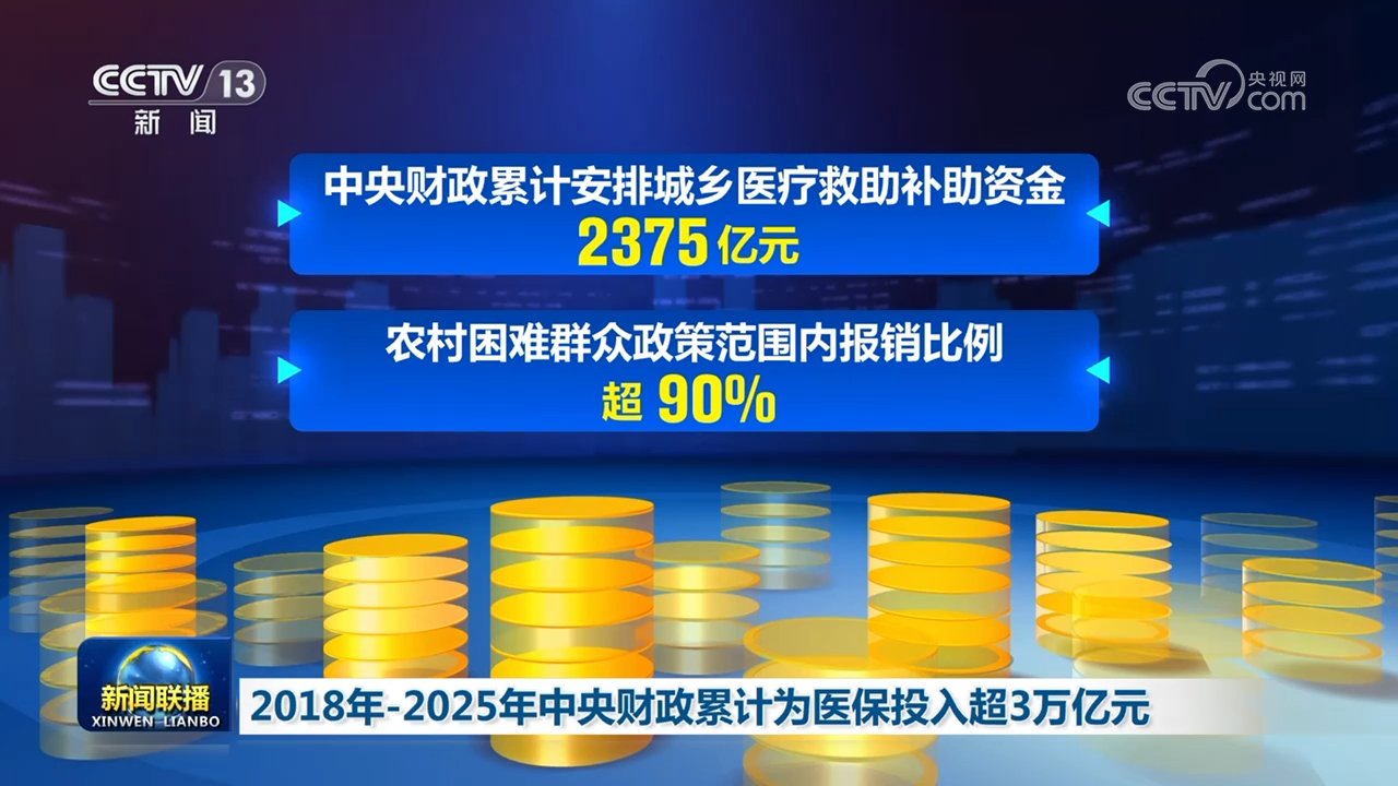 中央财政累计安排城乡医疗救助补助资金2375亿元,农村困难群众政策范围内报销比例超90%。