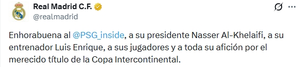 直播吧12月18日讯2025洲际杯,巴黎战胜弗拉门戈夺冠,皇马发文祝贺。