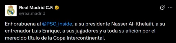皇马官方社媒也送上祝贺:“祝贺巴黎圣日耳曼俱乐部、主席纳赛尔·阿尔赫莱菲、主帅路易斯·恩里克、球员以及所有球迷,你们完全配得上洲际杯冠军。”