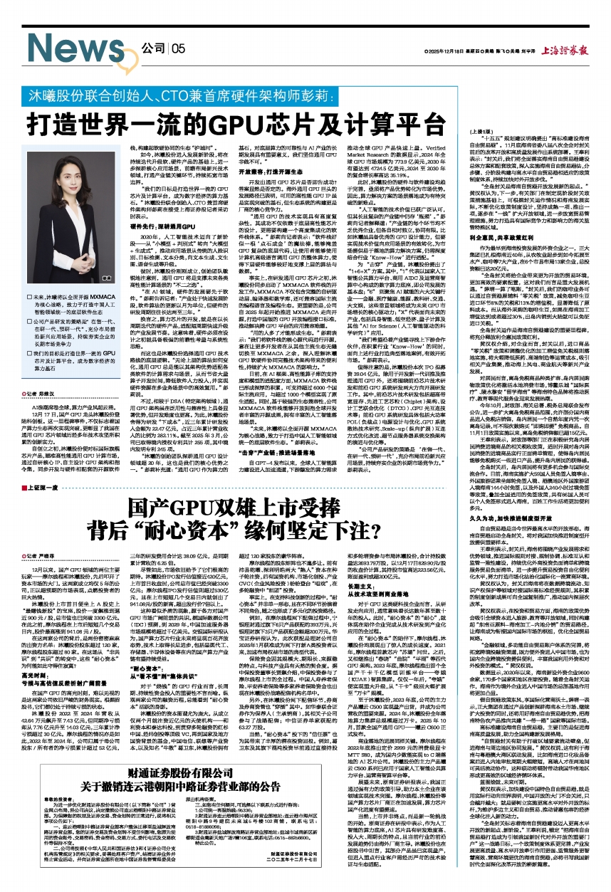 “我们的目标是打造世界一流的GPU芯片及计算平台,成为数字经济的算力基石。”沐曦股份联合创始人、CTO兼首席硬件架构师彭莉在接受上海证券报记者采访时表示。
