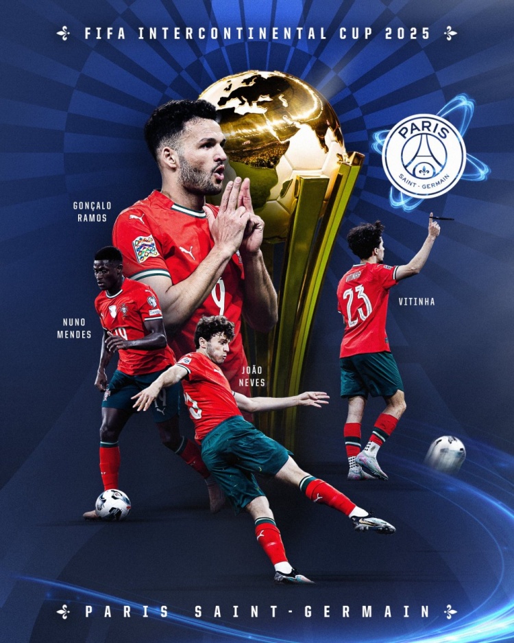 葡萄牙国家队官方发布海报,祝贺效力巴黎的葡萄牙籍球员若奥·内维斯、维蒂尼亚、努诺·门德斯和贡萨洛·拉莫斯随队夺冠,这也是他们今年夺得的第7个冠军,包括:法甲冠军、法国杯冠军、法国超级杯冠军、欧冠冠军、欧超杯冠军、洲际杯冠军以及欧国联冠军。