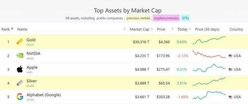 而从市值来看,随着周三逾4%的新一轮大涨行情展开,白银的市值目前已超越了近来风头正盛的AI巨头谷歌,跻身成为了全球第四大资产——目前市值规模仅低于黄金、英伟达和苹果。