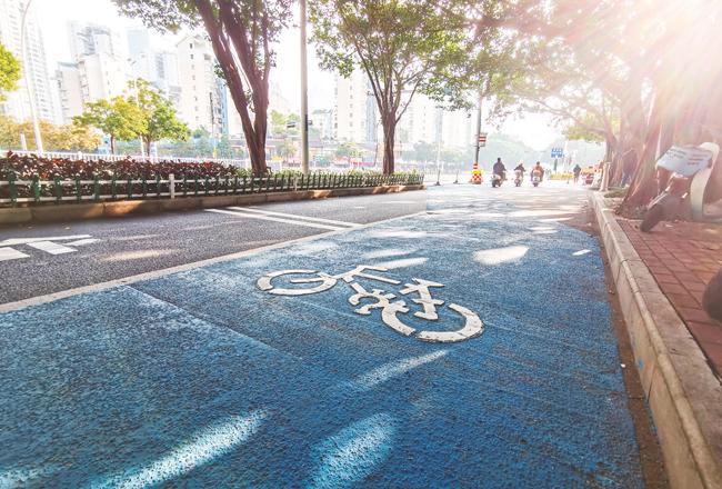 新启用的蓝色防滑路面清晰指引电动自行车行驶方向。记者韦峭摄