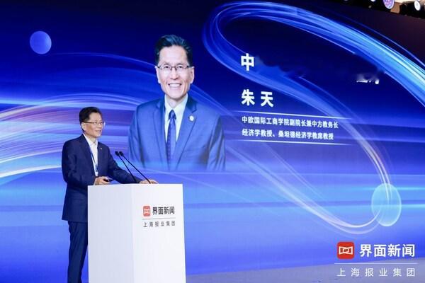 中欧国际工商学院副院长兼中方教务长、经济学教授、桑坦德经济学教席教授朱天在主旨演讲中就当前中国经济形势发表见解。他指出,中国经济虽展现出增长韧性,但持续一段时间的价格下行压力是当前核心挑战。