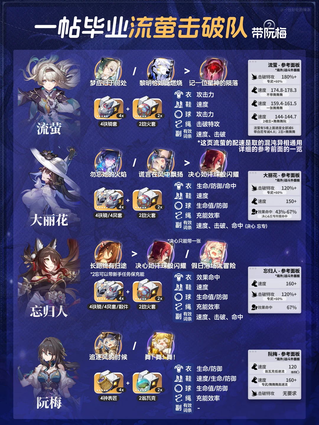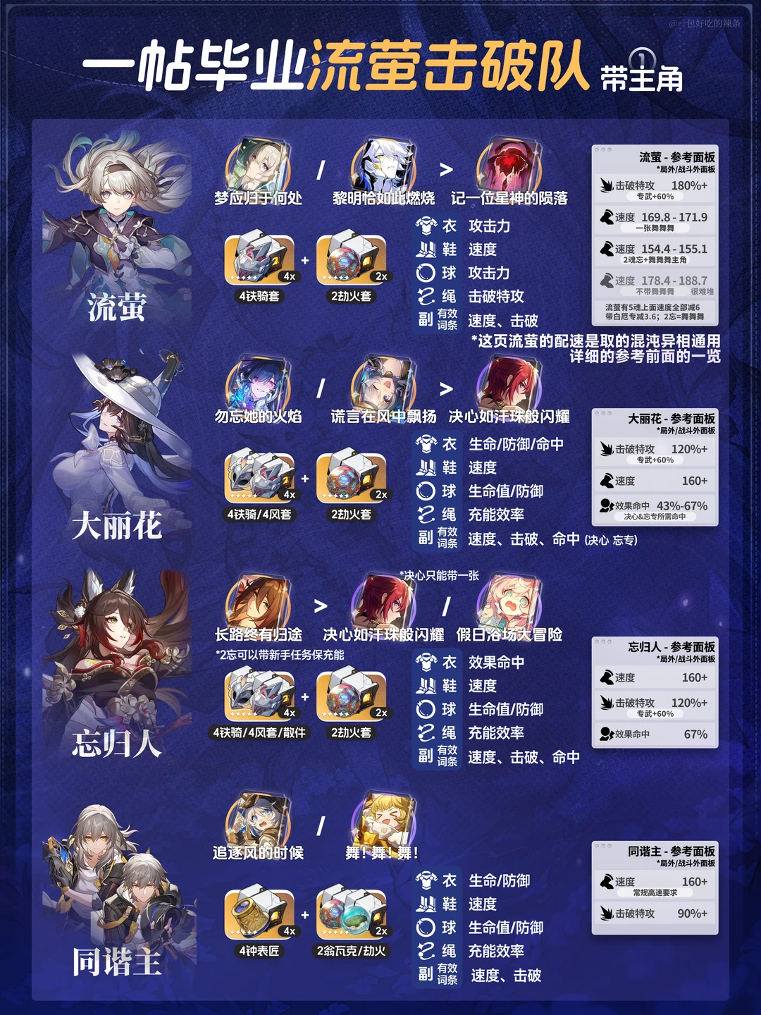 滴滴!这里是辣条 这期是流萤和大丽花的配速和全队养成攻略 配速只要在区间内的都是可以的,没有固定要求 - 另外非xp的话 建议流萤+忘归人已投入5金或以上补大丽花 普通月卡玩家现版本不要在击破队上继续投入超过两金