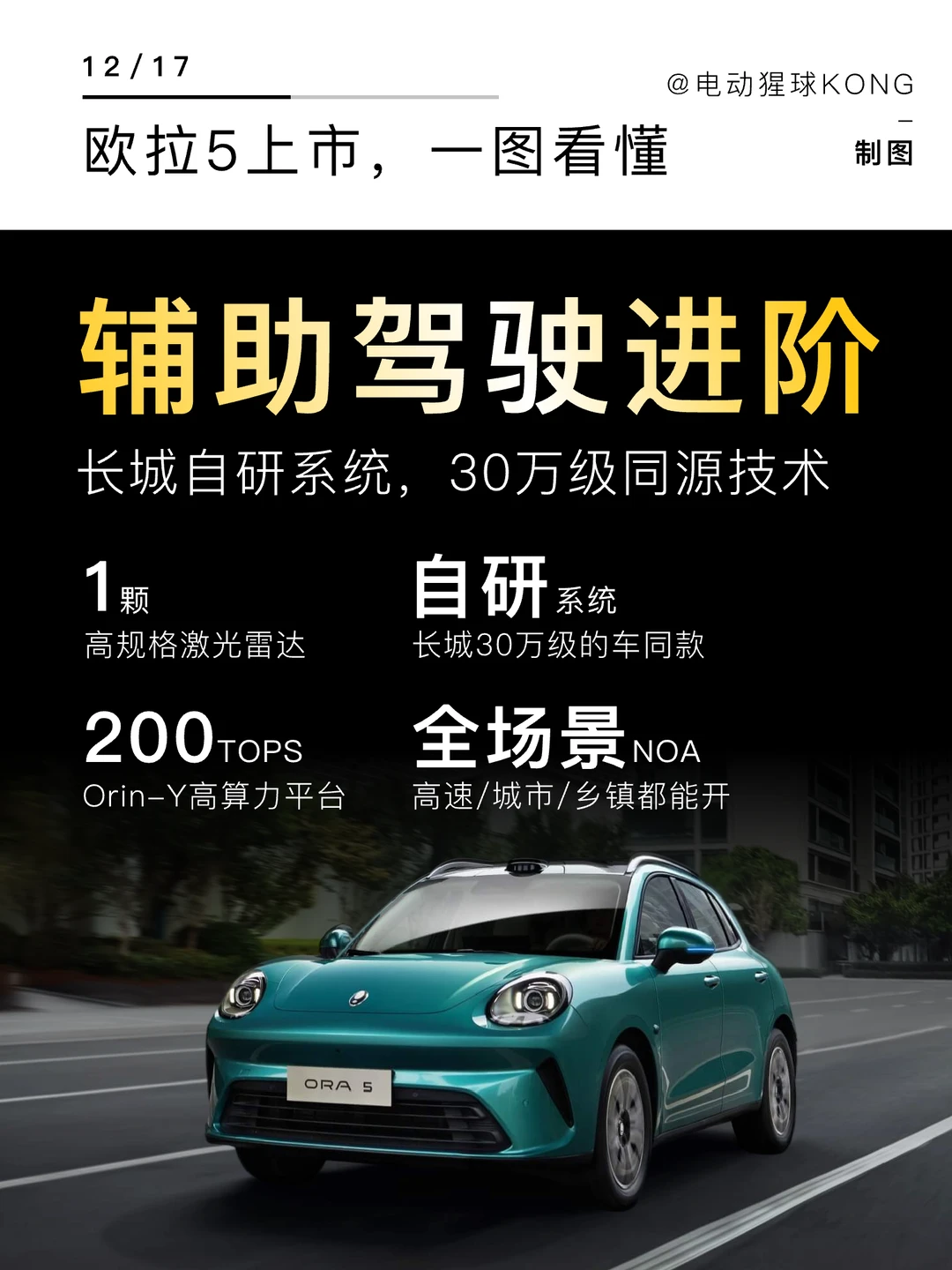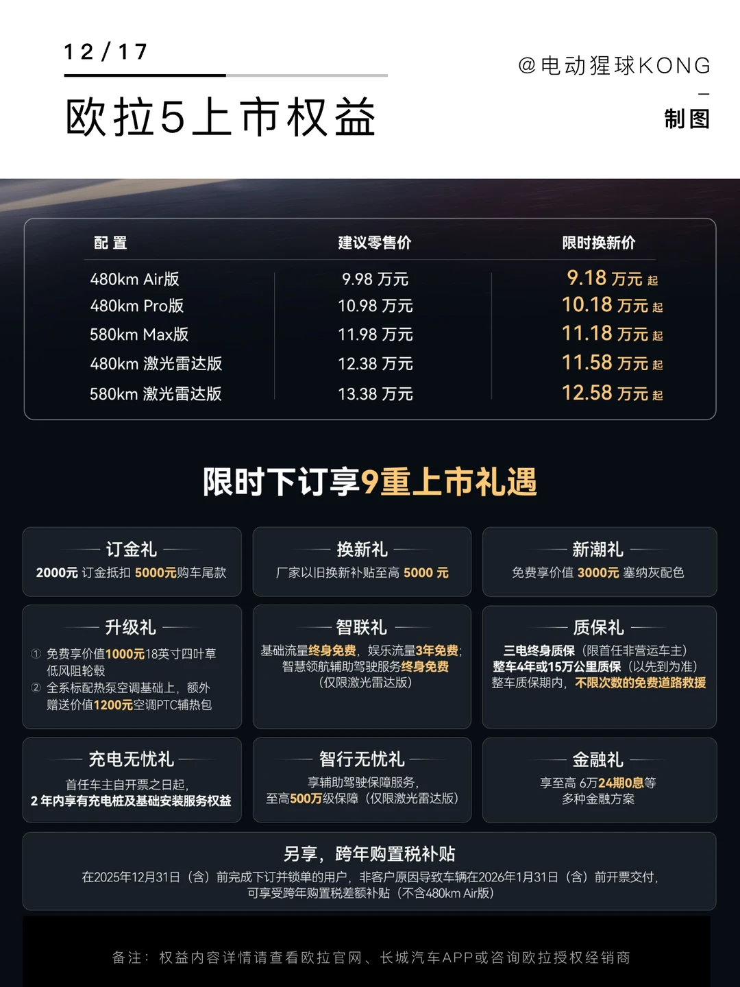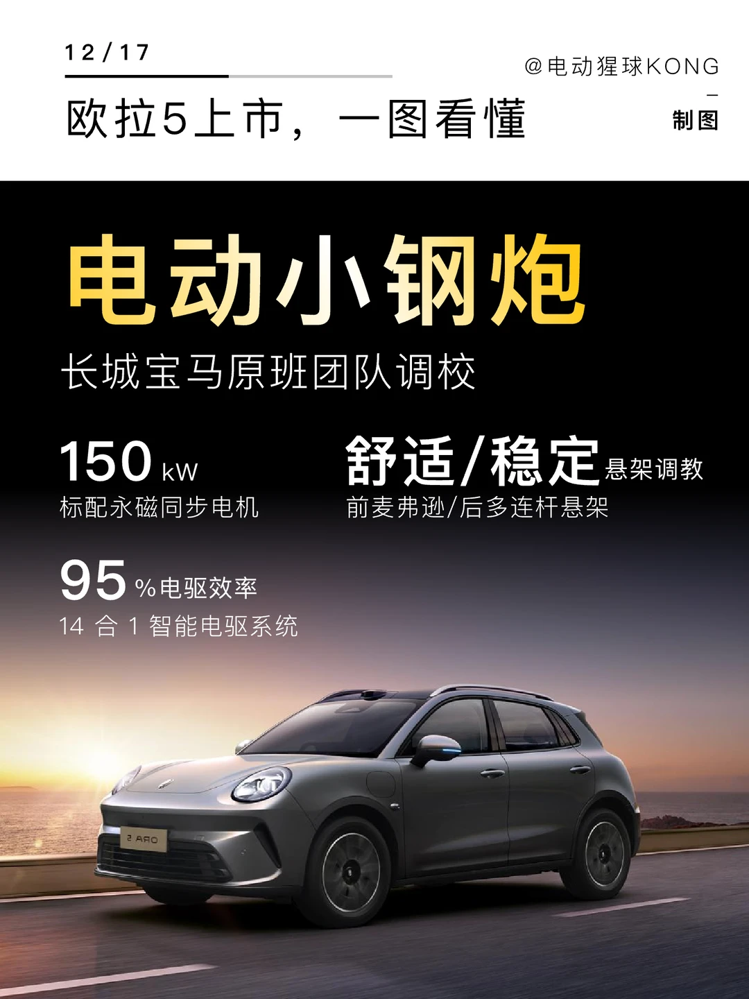 长城欧拉5终于上市,限时换新价9.18万起,发布会替大家总结了,关键点如下: 1️⃣第一次用“品牌+数字”的命名方式,好记、打破文化差异,也标志欧拉迈入全球化布局 2️⃣品牌经典的水滴大灯、隐藏式“破晓”尾灯、既延续了欧拉家族式设计元素,又有独属于长城欧拉5的全新的设计基因 3️⃣辅助驾驶的提升相当大 长城全栈自研Coffee Pilot Ultra(CP Ultra)第三代辅助驾驶系统终于上车,30万级的车系也在用!激光雷达版全车搭载1个激光雷达,共27个高精度传感器,全场景 NOA 功能,高速、城区、乡镇路都能用,辅助泊车能识别200多种场景 4️⃣底盘操控方面,由长城宝马团队打造,前麦弗逊➕后多连杆独立悬架,兼顾舒适与操控 CLTC工况480km/580km两个版本,实测续航达标率也很高 5️⃣值得买吗? 欧拉背靠长城汽车,有60万车主,就凭长城汽车十几年积累的底盘调教经验,和30万级智能辅助驾驶、智能座舱的科技下放,加上欧拉品牌的设计和产品定义,基本没有短板,值得推荐~ 6️⃣5个配置很好选: 480km Air版(限时换新价9.18万起):标配配置就很足!智慧巡航、ACC等基础辅助驾驶都有,质价比不错 480km Pro版(限时换新价10.18万起):续航没变,多了手机无线快充、电动后尾门、前排座椅通风 / 加热、外后视镜自动折叠,辅助驾驶升级540全景影像,城市通勤、对品质有要求的车主直接冲 580km Max版(限时换新价11.18万起):续航提升100km,还多了方向盘加热、星河律动氛围灯,升级9个扬声器,个人最推荐,估计是爆款,晚选要等车~ 480km 激光雷达版(限时换新价11.58万起):升级激光雷达版高阶辅助驾驶(全场景NOA等)适合经常跑长途的宝子,一个好的辅助驾驶能省很多精力 580km 激光雷达版(限时换新价12.58万起):续航拉满,辅助驾驶拉满,适合需要越级体验的宝子,一步到位不纠结,情绪价值和体验都到位了,没有短板~ *限时换新价包含“订金礼”和“换新礼”:至高 5000元以旧换新补贴 最后,手握10多个W,你会选哪个配置?
