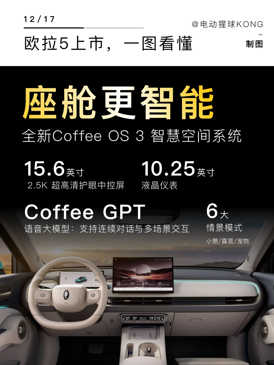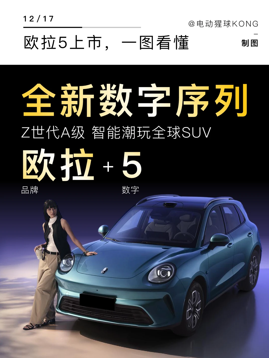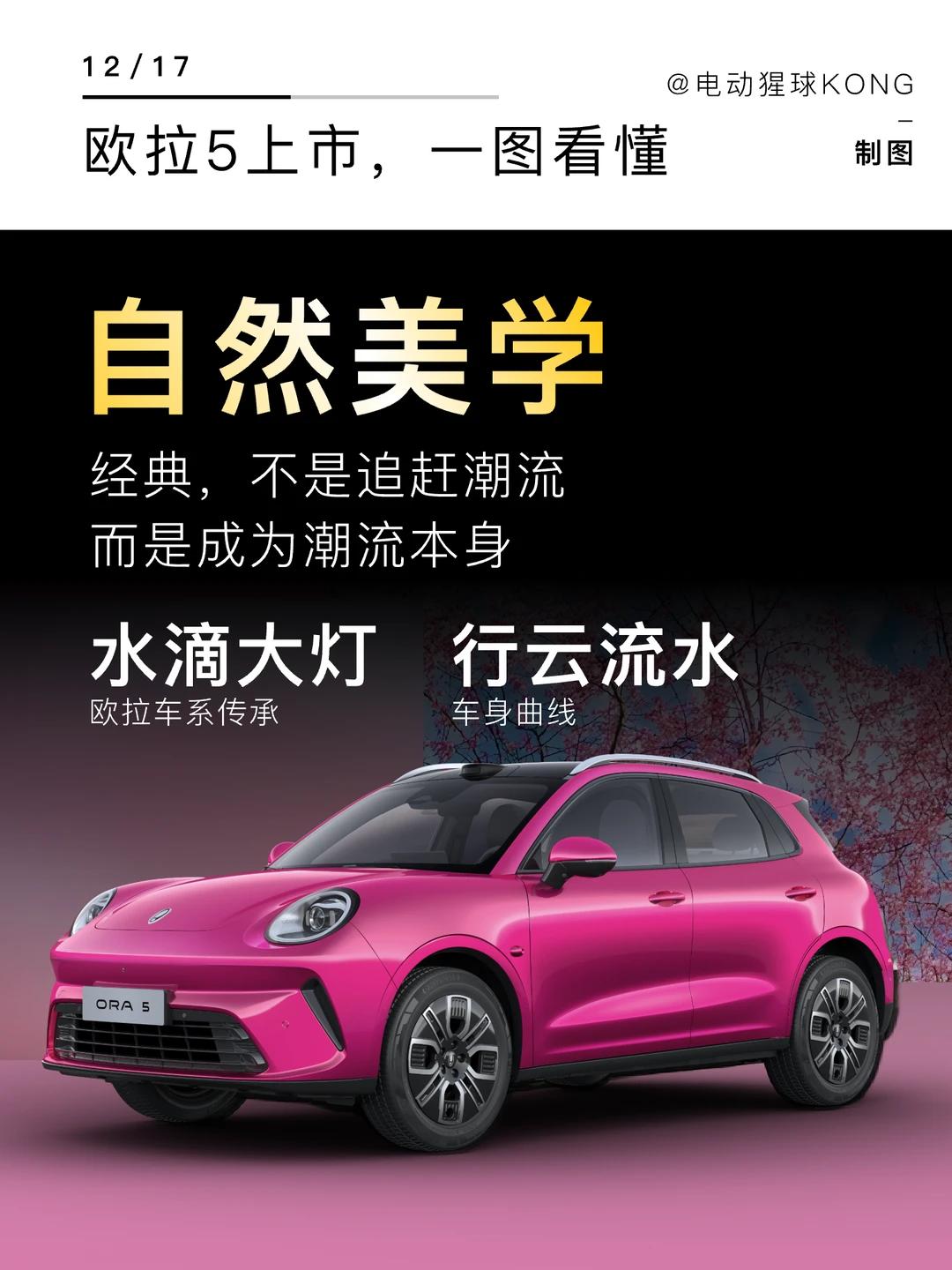 长城欧拉5终于上市,限时换新价9.18万起,发布会替大家总结了,关键点如下: 1️⃣第一次用“品牌+数字”的命名方式,好记、打破文化差异,也标志欧拉迈入全球化布局 2️⃣品牌经典的水滴大灯、隐藏式“破晓”尾灯、既延续了欧拉家族式设计元素,又有独属于长城欧拉5的全新的设计基因 3️⃣辅助驾驶的提升相当大 长城全栈自研Coffee Pilot Ultra(CP Ultra)第三代辅助驾驶系统终于上车,30万级的车系也在用!激光雷达版全车搭载1个激光雷达,共27个高精度传感器,全场景 NOA 功能,高速、城区、乡镇路都能用,辅助泊车能识别200多种场景 4️⃣底盘操控方面,由长城宝马团队打造,前麦弗逊➕后多连杆独立悬架,兼顾舒适与操控 CLTC工况480km/580km两个版本,实测续航达标率也很高 5️⃣值得买吗? 欧拉背靠长城汽车,有60万车主,就凭长城汽车十几年积累的底盘调教经验,和30万级智能辅助驾驶、智能座舱的科技下放,加上欧拉品牌的设计和产品定义,基本没有短板,值得推荐~ 6️⃣5个配置很好选: 480km Air版(限时换新价9.18万起):标配配置就很足!智慧巡航、ACC等基础辅助驾驶都有,质价比不错 480km Pro版(限时换新价10.18万起):续航没变,多了手机无线快充、电动后尾门、前排座椅通风 / 加热、外后视镜自动折叠,辅助驾驶升级540全景影像,城市通勤、对品质有要求的车主直接冲 580km Max版(限时换新价11.18万起):续航提升100km,还多了方向盘加热、星河律动氛围灯,升级9个扬声器,个人最推荐,估计是爆款,晚选要等车~ 480km 激光雷达版(限时换新价11.58万起):升级激光雷达版高阶辅助驾驶(全场景NOA等)适合经常跑长途的宝子,一个好的辅助驾驶能省很多精力 580km 激光雷达版(限时换新价12.58万起):续航拉满,辅助驾驶拉满,适合需要越级体验的宝子,一步到位不纠结,情绪价值和体验都到位了,没有短板~ *限时换新价包含“订金礼”和“换新礼”:至高 5000元以旧换新补贴 最后,手握10多个W,你会选哪个配置?