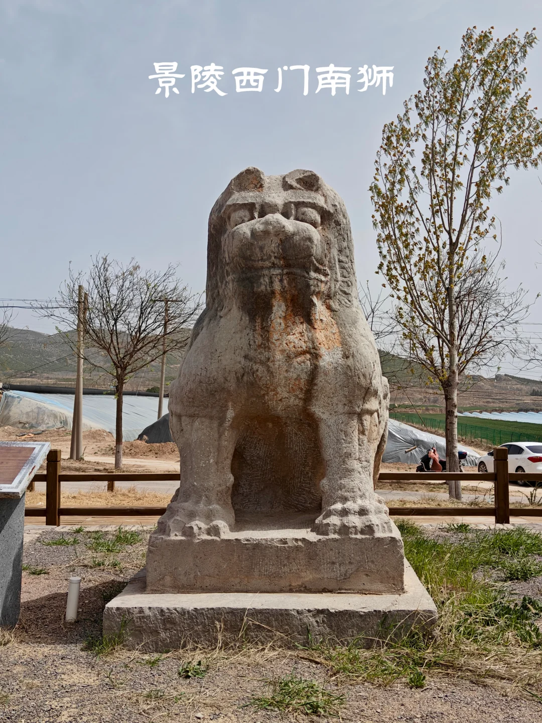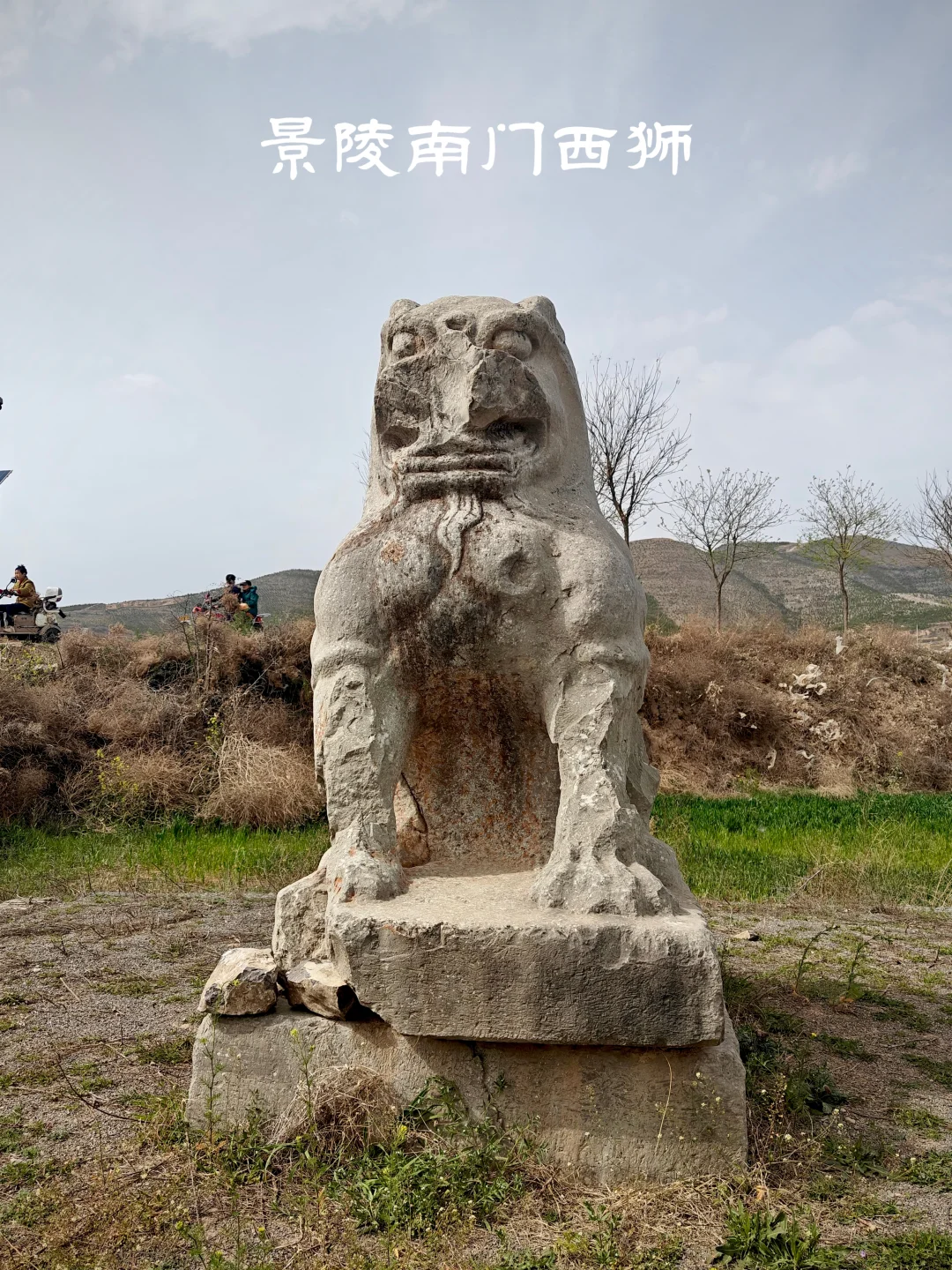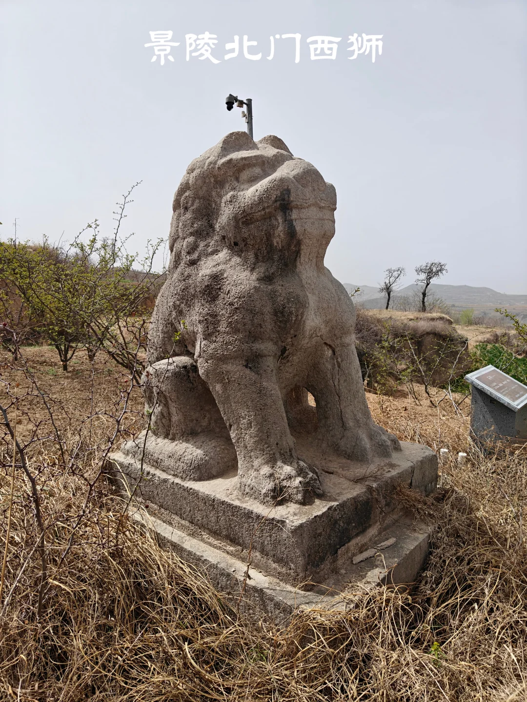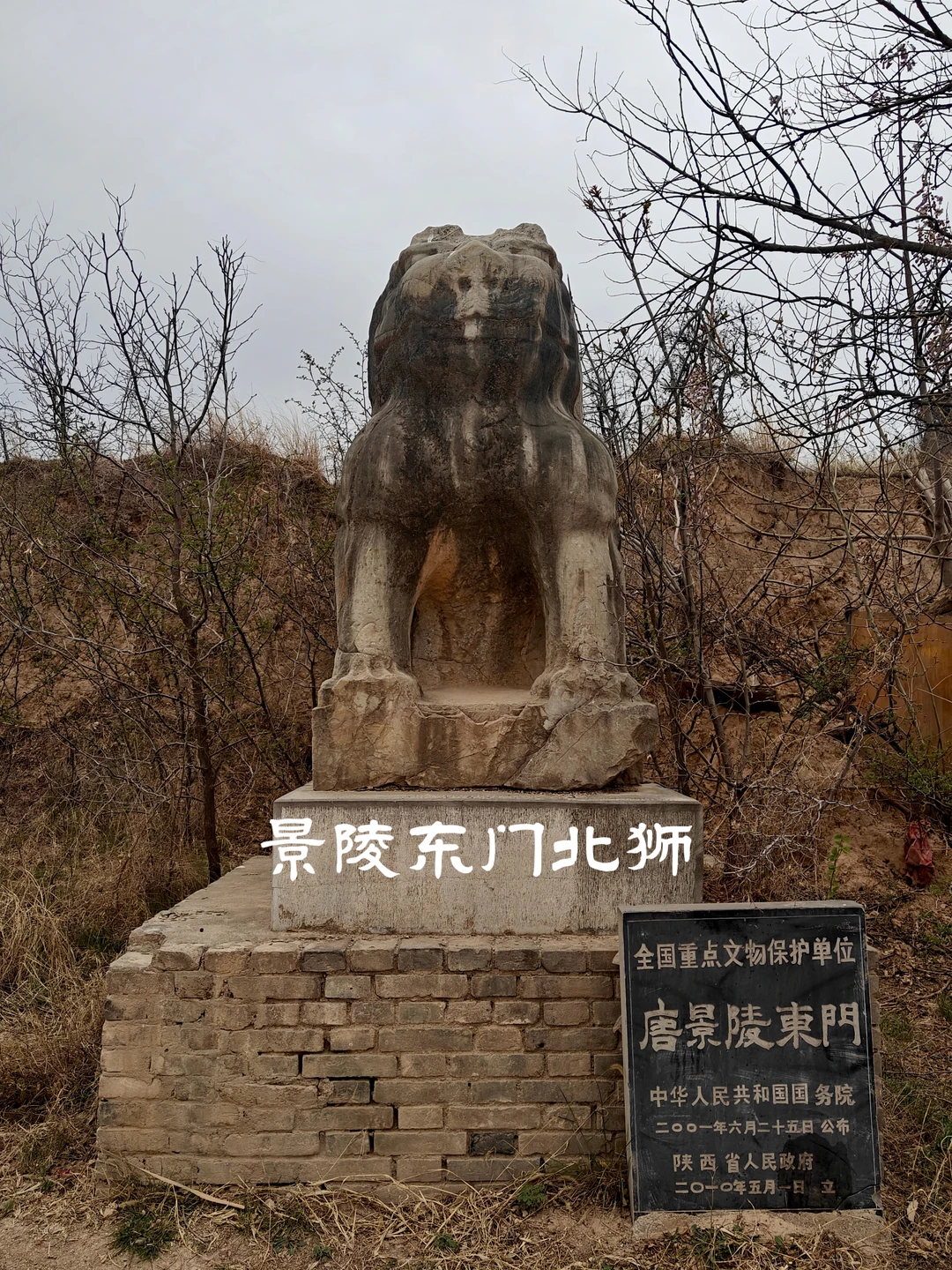 唐朝帝陵自高宗乾陵起,于内城四神门外各列置一对石狮,共4对8只。景陵目前存有7只石狮,南门东狮缺失。