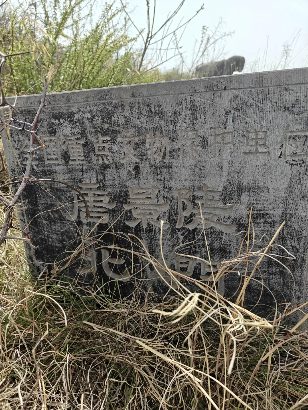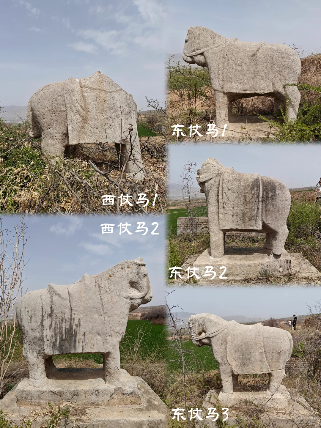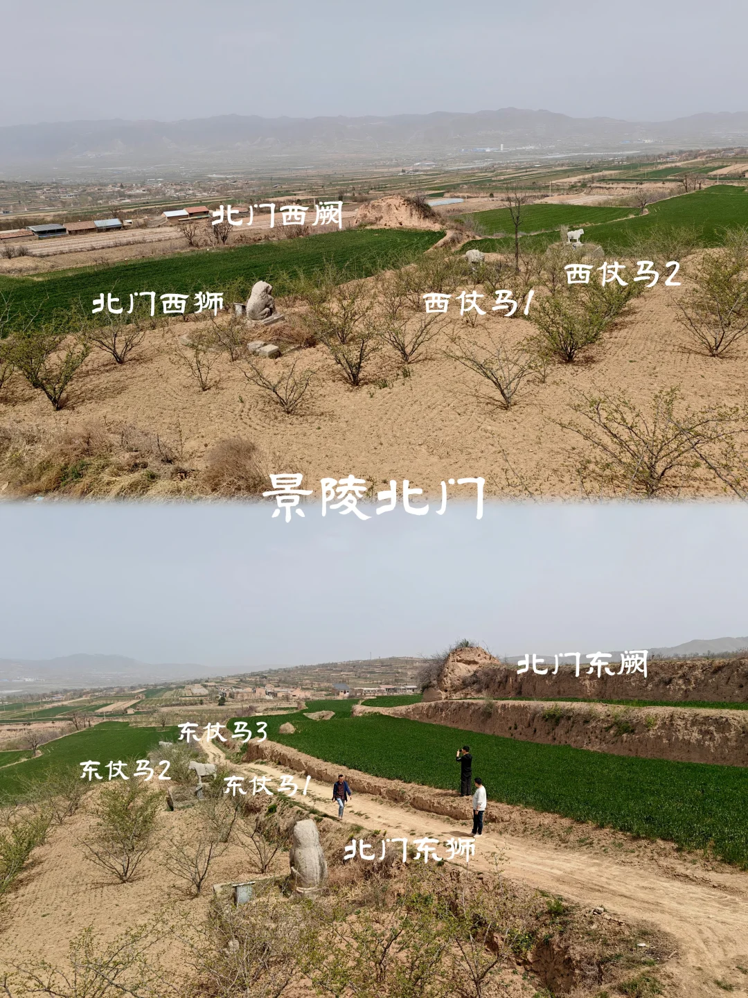 景陵北门,东、西两狮均倒地。东侧三仗马无一全者,西侧仗马仅有一匹幸存,仍伫立在田间其他两匹均已残破,五匹仗马残骸中都有马倌的残骸,东侧南二仗马碎石中马倌较为完整。仗马以北尚有四只小虎,最北两只为走虎,靠近玄武门两只为蹲虎(西侧小蹲虎无面),位置均已移动。