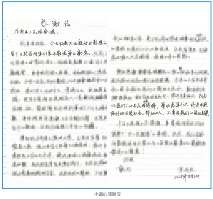 小磊在感谢信中承诺,“我会以你们一心为民办事为榜样,常怀感恩之心,将来用实际行动回报社会,帮助他人,不辜负你们的殷切期望……”
