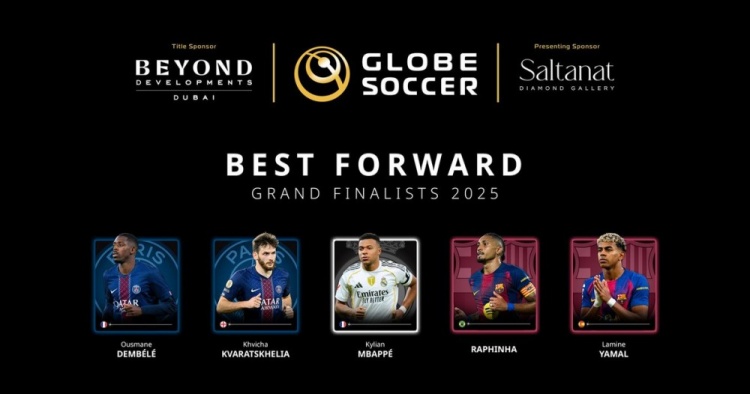 直播吧12月18日讯环球足球奖公布2025年年度最佳前锋五人候选名单,登贝莱、姆巴佩、亚马尔在列。