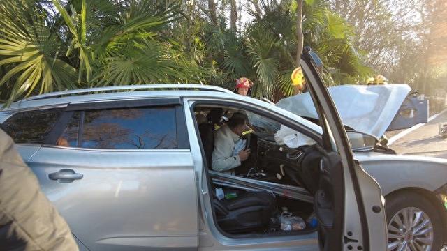 头图为小轿车撞车后车头变形卡住司机。消防部门供图