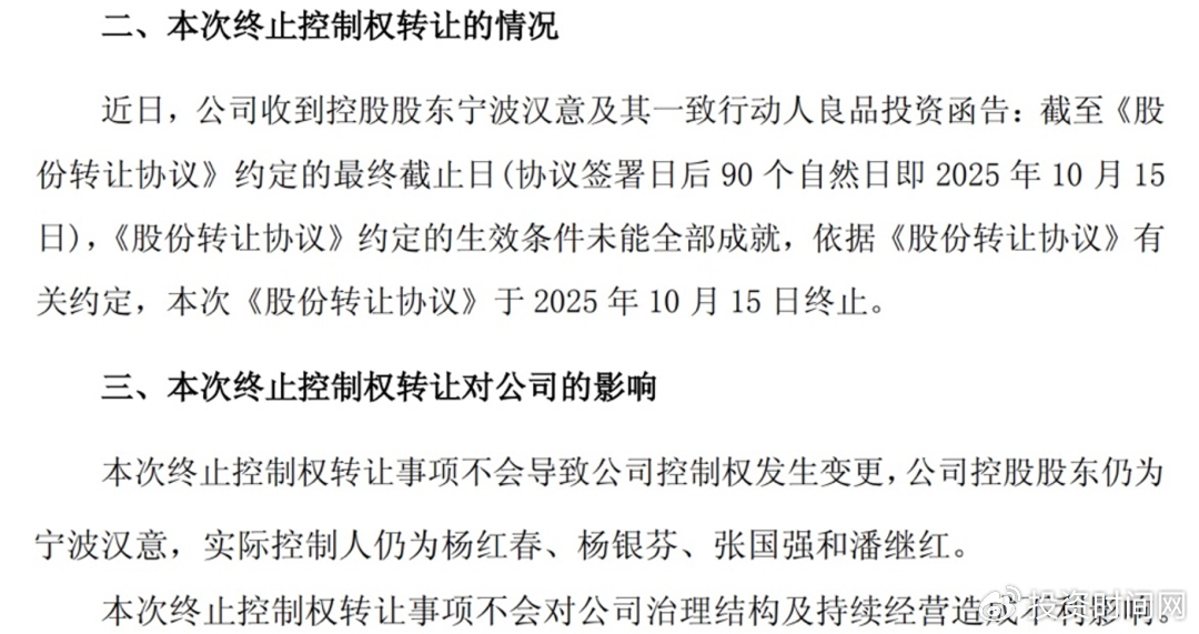 2025年10月,良品铺子披露称,截至宁波汉意及其一致行动人与长江国贸签订的《股份转让协议》所约定的最终截止日(2025年10月15日),协议约定的生效条件仍未能全部满足,基于此,这一控制权转让事项宣告终止,良品铺子的控股股东仍为宁波汉意。