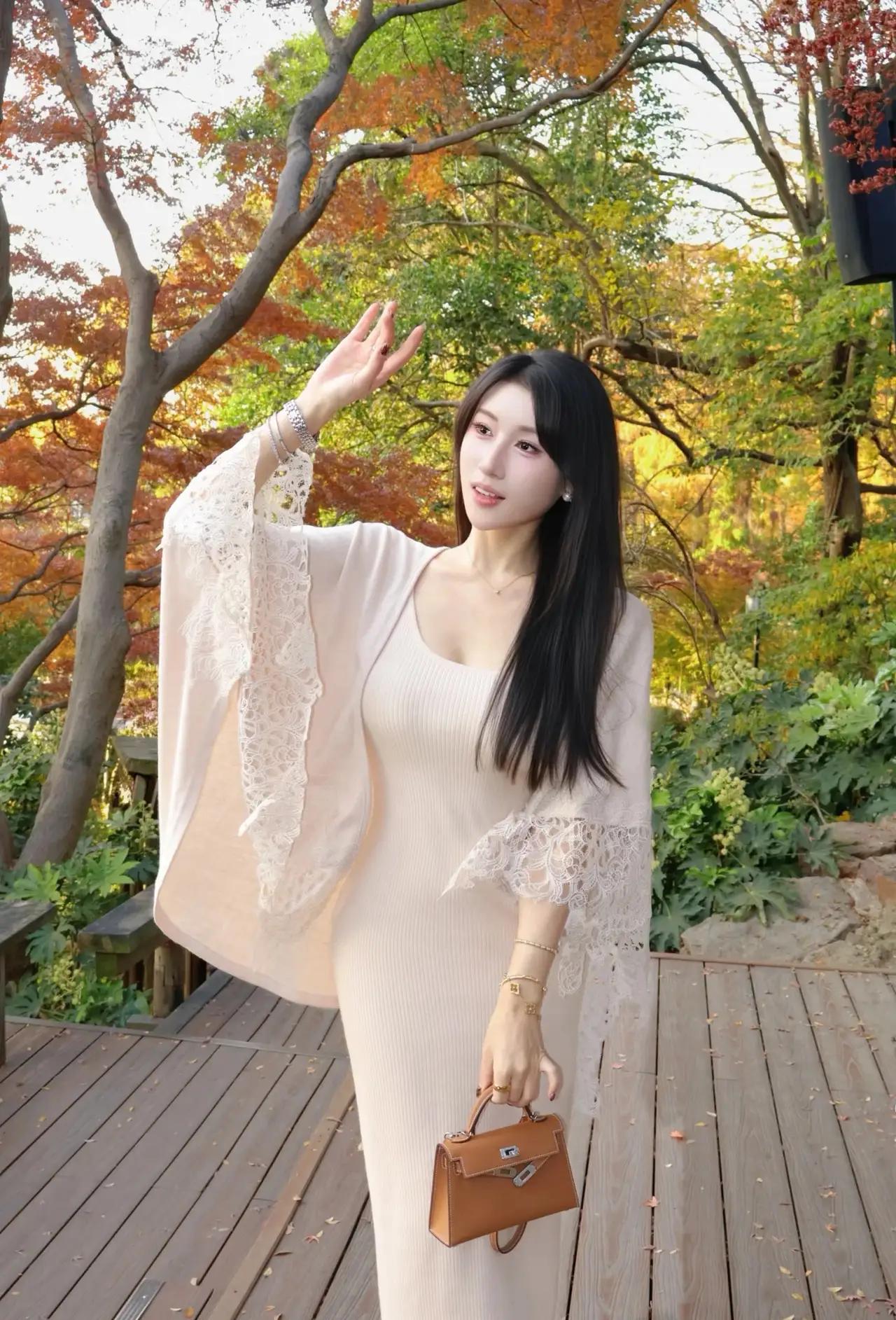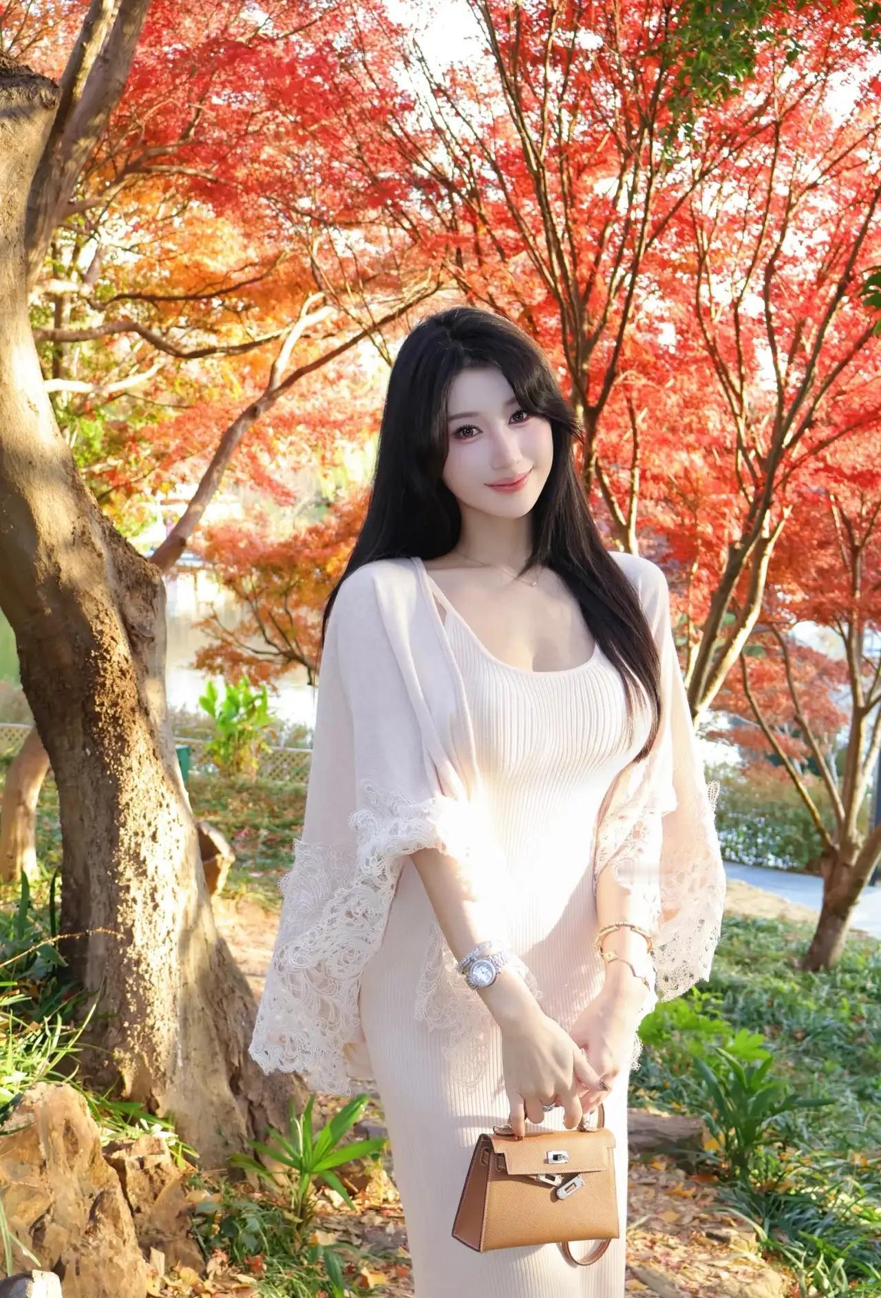秋日的午后,阳光透过层层叠叠的红叶,洒在一位优雅女性的身上。她站在一片秋意盎然的树林中,仿佛是从画中走出的仙子。 她的穿着简约而不失品味。一件白色的开衫,蕾丝袖子增添了几分柔美,内搭的浅色紧身连衣裙勾勒出她的身形。她的长发如瀑布般垂落在肩头,发丝在微风中轻轻飘动。她的手中握着一个棕色的手提包,小巧而精致,与她手腕上的手表和戒指相得益彰,彰显出她的独特品味。 她的目光温柔而深邃,仿佛在欣赏着这片美丽的秋景,又像是在思考着什么。她的嘴角微微上扬,带着一丝淡淡的微笑,给人一种宁静而美好的感觉。 周围的景色也格外迷人。树叶已经变成了鲜艳的红色,在阳光的照耀下,仿佛是一团团燃烧的火焰。地面上铺满了绿色的植被和一些石头,与红色的树叶形成了鲜明的对比。阳光透过树叶的缝隙洒下斑驳的光影,给人一种温暖而宁静的感觉。 在这片美丽的秋景中,她仿佛成为了大自然的一部分。她的存在让这片秋景更加生动而富有诗意。她的优雅与宁静,与秋日的美丽相得益彰,构成了一幅美丽的画卷。 秋日午后,阳光、红叶、优雅的女性,构成了一幅美丽的画面。这幅画面让人感受到大自然的美丽与宁静,也让人感受到生活的美好与诗意。