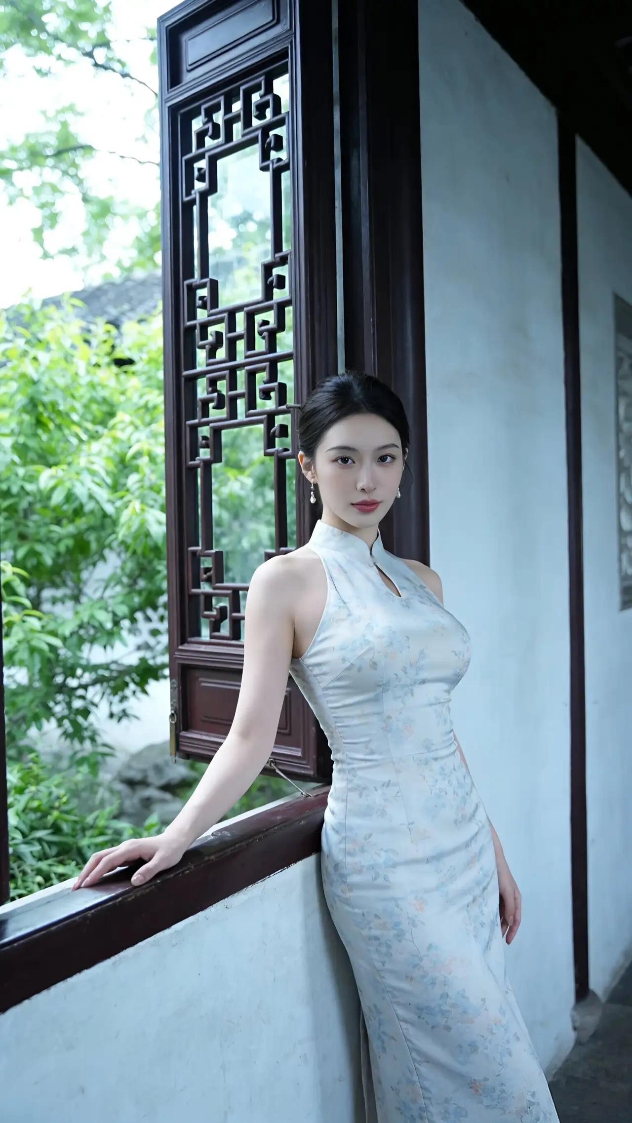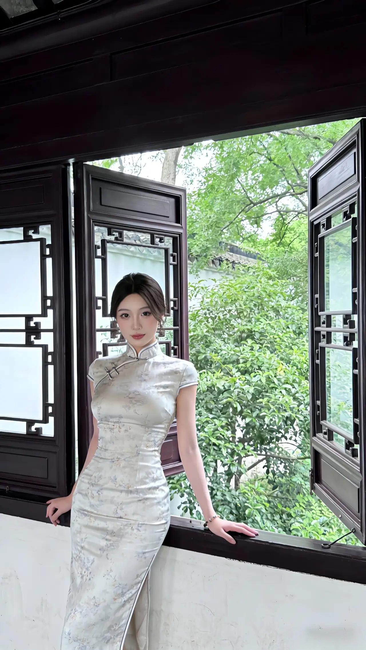 图片中,一位女性身着浅米色底、印有淡蓝与浅黄色小碎花图案的修身旗袍,立领、盘扣与侧开叉设计尽显传统韵味,短袖剪裁露出纤细手臂,勾勒出优雅曲线。她乌黑长发梳成低发髻,几缕碎发自然垂落,妆容精致,红唇衬得气色温婉。她站在中式木质花窗前,双手轻搭在深色窗沿上,身后花窗雕有传统回纹与几何纹样,透出古朴质感;窗外绿树成荫,枝叶繁茂,朦胧绿意为背景添了份清幽雅致,室内白色墙面简洁素净,与深色木窗形成色彩对比。整体画面融合传统服饰、中式建筑元素与自然景致,营造出温婉典雅的氛围,尽显东方美学意蕴。