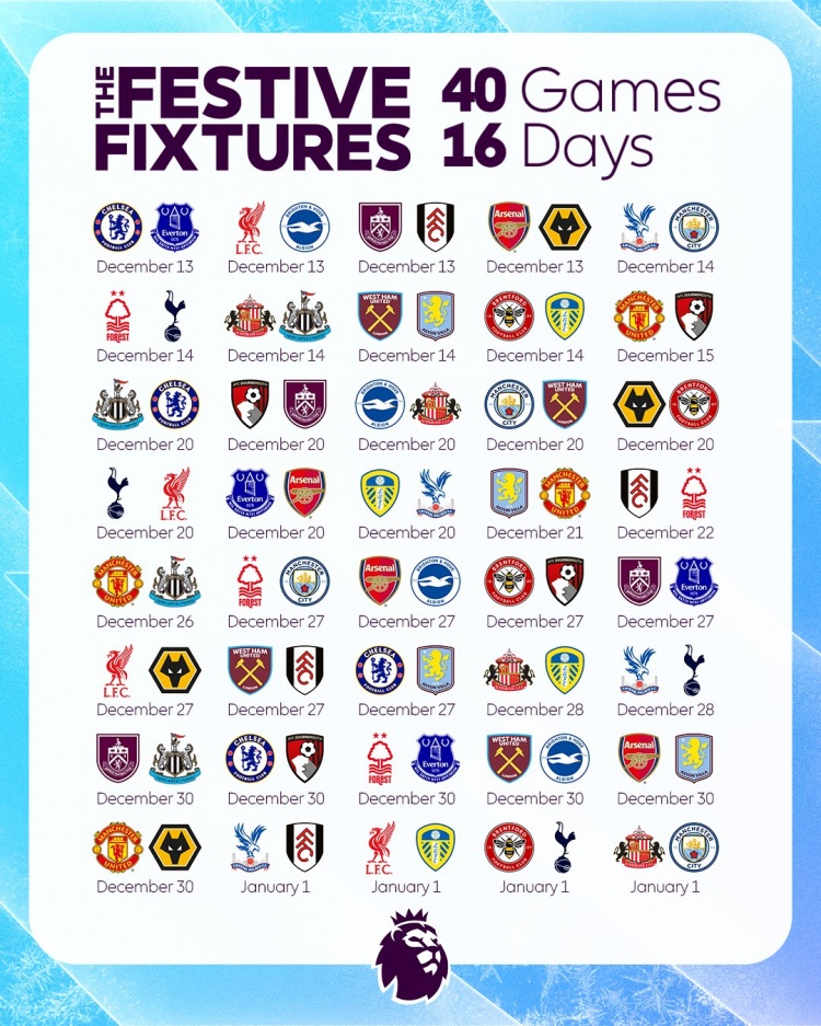 直播吧12月18日讯英超官方更新社媒动态,晒出节日期间赛程图片。