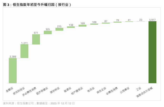 恒生指数公司表示,金融业为恒指今年的最大贡献行业。今年初至12月12日,恒指上涨5,917点或29%,收市报25,976点。值得留意的是,今年以来的升势广泛,全部12个HSICS行业皆录得正面贡献。其中,三个行业明显跑出,合共占指数升幅的79%。金融业贡献2,389点,相当于指数升幅的40%,令其成为期内最大贡献行业。其后则是资讯科技业及非必需消费品,分别贡献指数升幅的22%及16%。