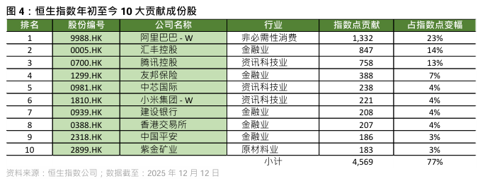 成份股层面上,阿里巴巴-W(09988)为最大贡献者,推动恒指今年以来升势1,332点或整体升幅的23%。接下来的主要推动力则来自汇丰控股(00005)和腾讯(00700),分别贡献升幅的14%及13%。截至2025年12月12日,恒指前十大贡献成份股的综合影响为4,569点,相当于年初至今升幅的77%。