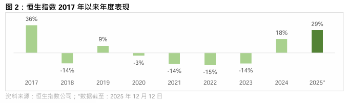 12月17日,恒生指数公司发文指出,2025年有望成为恒生指数(简称:恒指)过去10年表现最为出色的年份之一。随着港股通创纪录的资金流入、对人工智能未来发展的憧憬,以及减息等因素提振市场气氛,恒指于2024年上升18%之后,上升动力再延续至2025年。截至2025年12月12日,恒指年初至今录得29%的升幅,主要是由金融业、资讯科技业,以及非必需消费品带动。随着2025年临近尾声,恒指有望录得2017年(+36%)以来的最佳年度表现。