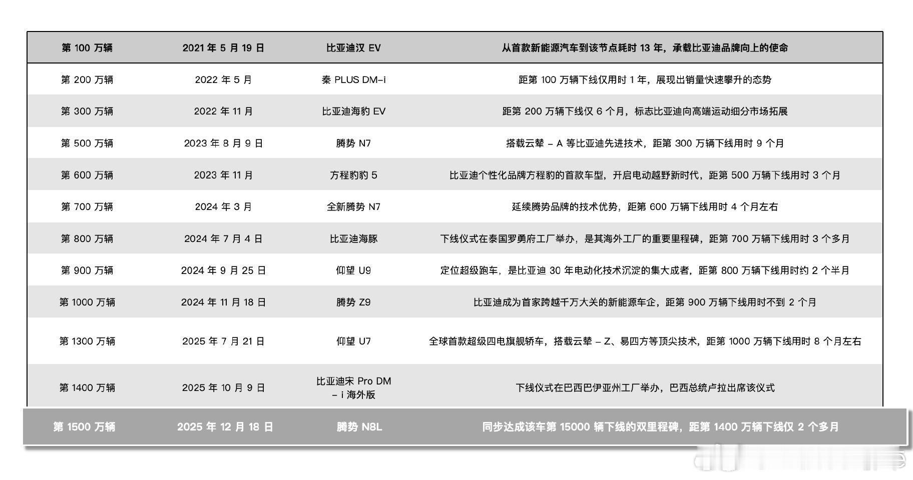 比亚迪第1500万辆新能源汽车下线12月18日,比亚迪第1500万辆新能源车在济南下线,这台车还是腾势N8L。你可以不喜欢比亚迪,但真没办法装作“1500万没啥”,这就是工业能力的硬通货。更离谱的是:从1000万到1500万只用了13个月。说白了,这不是“某款车爆了”,是整条供应链+制造体系已经滚成雪球了。这样的销量成绩,不得不认可。但销量堆到1500万也只是上半场,下半场是售后、品控、软件体验、海外合规和品牌高端化,我还是挺期待比亚迪的表现的。新能源汽车大v聊车