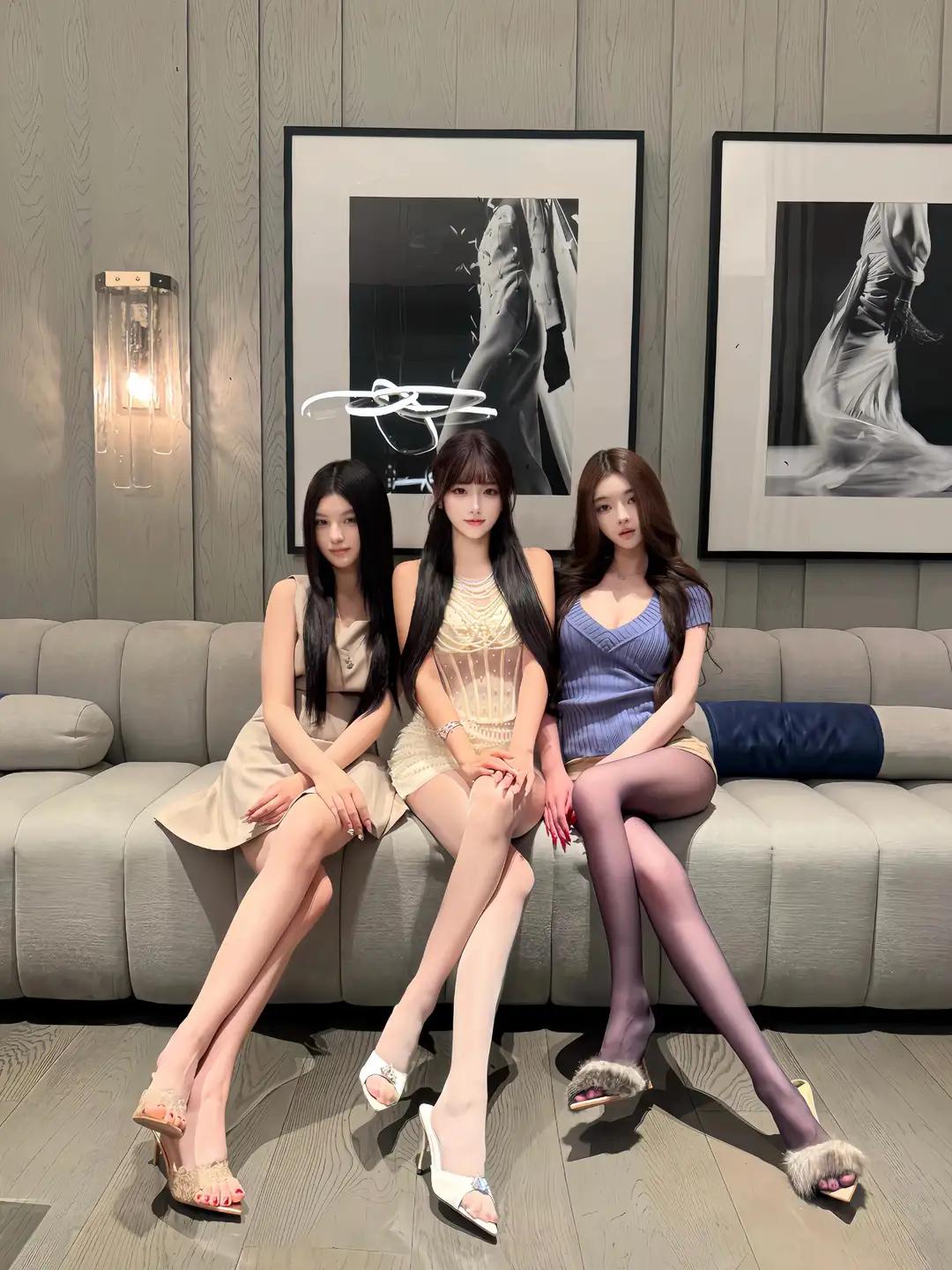 《沙发上的三位女性》 这张图片展现了三位女性坐在沙发上的场景,背景是现代风格的室内环境,墙上挂着一幅抽象艺术画。三位女性都穿着时尚,表情自然,姿态轻松。 左边的女性穿着浅色连衣裙,长发披肩,手指轻点脸颊,显得俏皮。她的姿态流露出一种轻松自在的感觉,仿佛在享受着当下的时刻。中间的女性穿着浅色无袖连衣裙,长发披肩,面带微笑,双手放在膝盖上,显得优雅。她的表情和姿态展现出一种自信和从容。右边的女性穿着蓝色针织上衣和浅色短裙,搭配黑色丝袜,长发披肩,双手交叠放在腿上,姿态端庄。她的穿着和姿态体现出一种稳重和成熟。 沙发是浅灰色,背景墙为木质纹理,整体氛围温馨且时尚。这幅抽象艺术画为整个场景增添了一种艺术气息,使得整个空间显得更加高雅和富有品味。三位女性的存在为这个空间注入了活力和生机,使得整个画面更加生动和有趣。 总的来说,这张图片通过三位女性的姿态、表情和穿着,以及室内环境的布置,展现了一种现代、时尚、温馨和艺术的生活氛围。这种氛围让人感受到一种舒适和愉悦,也让人对现代生活充满了向往和期待。