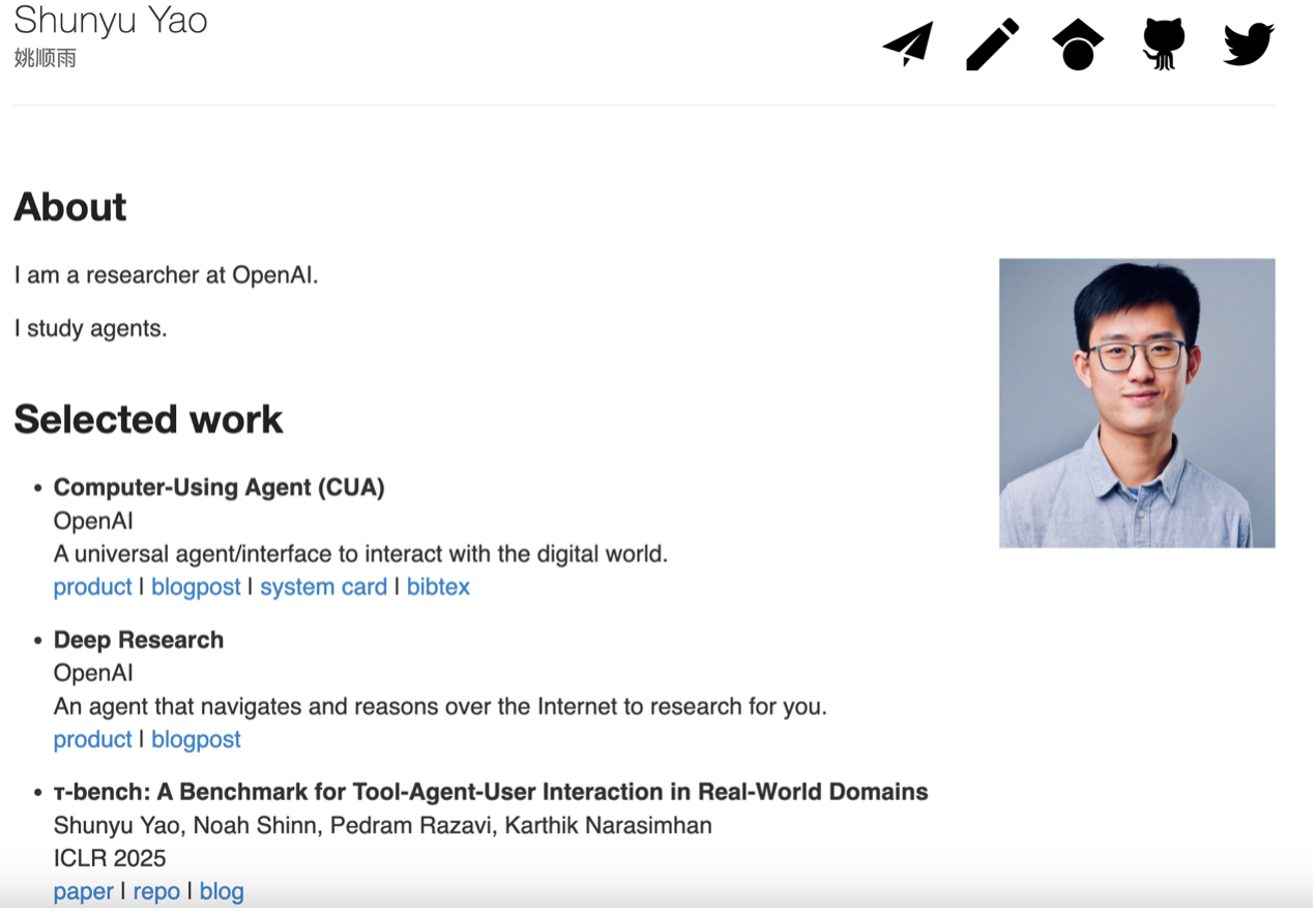 2019年本科毕业后,姚顺雨进入普林斯顿大学继续深造,攻读计算机科学博士学位;2024年博士毕业即加入OpenAI,参与智能体产品Operator与DeepResearch的开发,成为这两大项目的关键贡献者。凭借在AI领域的突破性研究,2025年5月,27岁的他成功入选《麻省理工科技评论》TR35榜单,成为该奖项中国区最年轻的入选者之一。