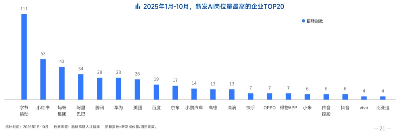 而同行在“抢人”上也毫不退让。时代财经从脉脉获悉的一份《2025年度⼈才迁徙报告》显示,2025年1-10月,字节跳动位列热招企业首位,美团和阿里巴巴分列二、三位,腾讯位列第四。新发AI岗位量最多的企业是字节跳动,紧随其后的是小红书、蚂蚁集团;阿里巴巴、腾讯,位居四、五。