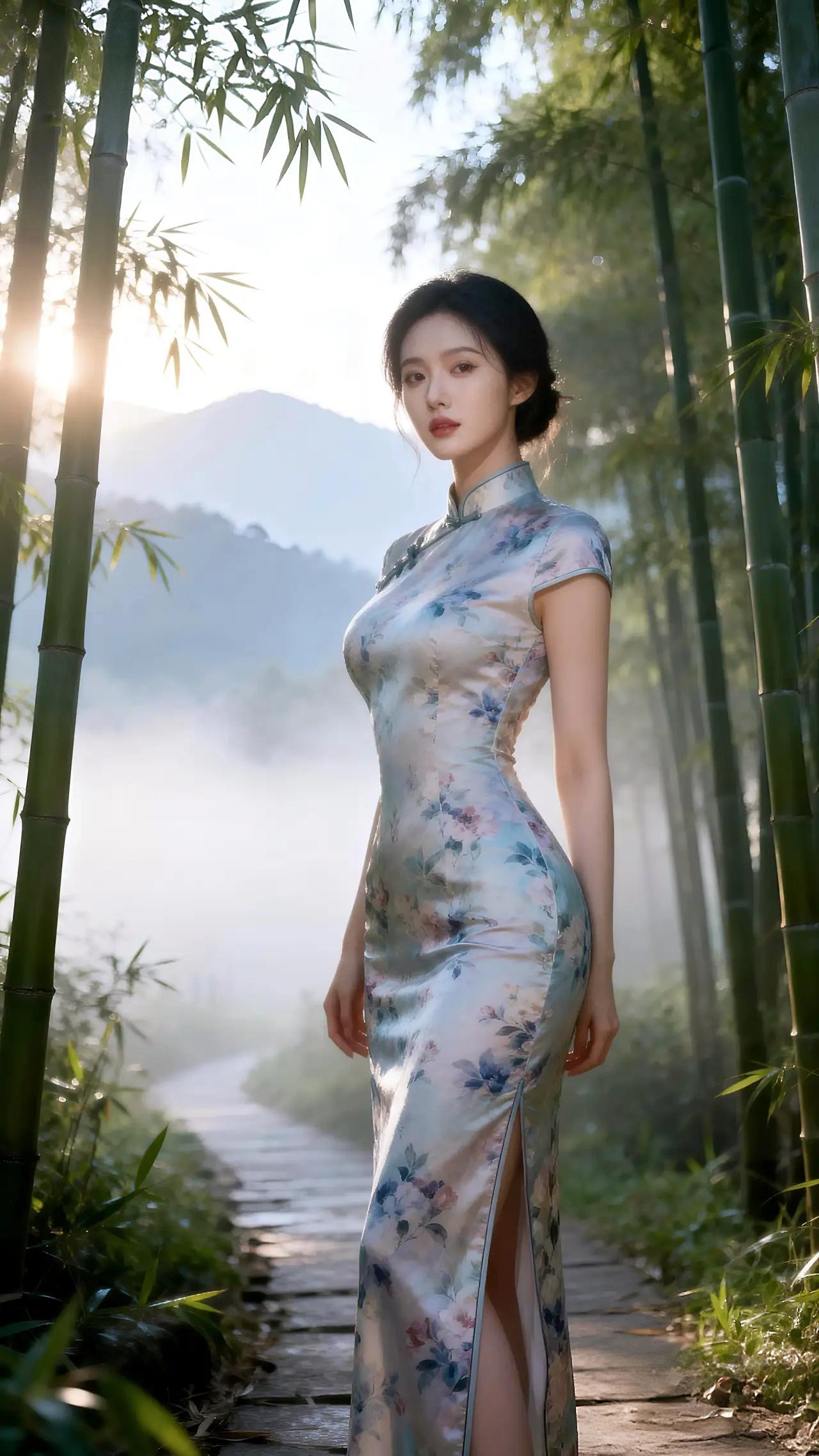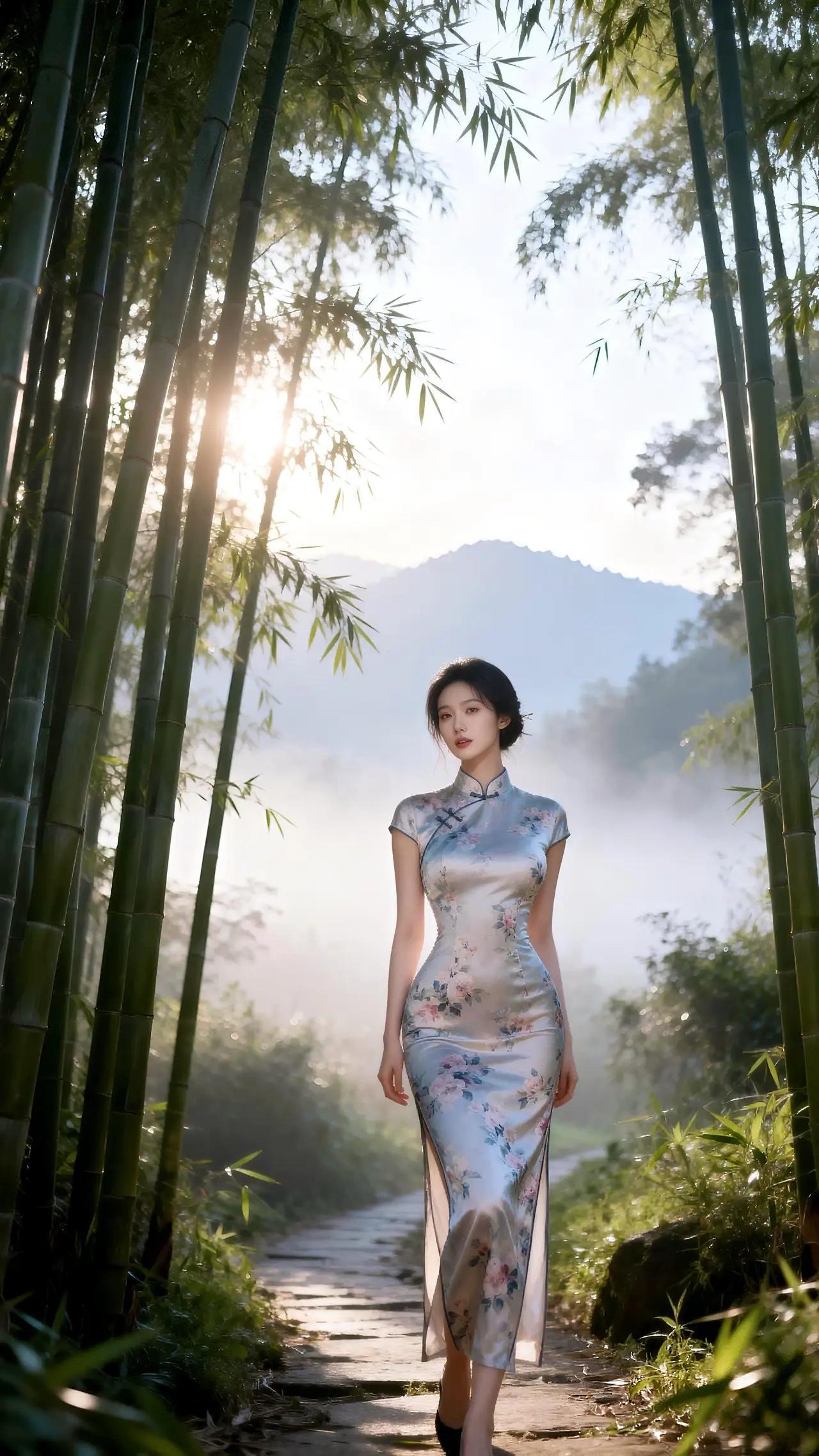 《旗袍美人:古典与自然的和谐乐章》 竹影婆娑,晨雾缭绕,一位身着旗袍的佳人静立其间。她仿佛从水墨画中走出,将东方古典美与自然景致完美融合,成为这幅画卷的灵魂所在。 旗袍,这一承载着中华文化精髓的服饰,在她的身上焕发出新的生机。浅蓝与粉色交织的布料上,牡丹与梅花竞相绽放,针脚细密如春雨润物,勾勒出她曼妙的身姿。领口处的盘扣,如蝴蝶停驻,诉说着岁月的静好;裙摆的开衩,恰似微风拂过竹林,轻盈而优雅。阳光穿透竹叶,斑驳的光影洒在旗袍之上,仿佛为这件艺术品镀上了一层金边,更添几分神秘与高贵。 她的气质与竹林相得益彰。竹,自古以来便是高洁、坚韧的象征,而她的存在,则为这片竹林注入了柔美与灵动。她轻抚竹节,指尖传来的凉意与旗袍的丝滑质感交织,仿佛在与自然进行一场无声的对话。她的发髻高挽,露出光洁的额头与修长的脖颈,宛如竹枝般挺拔;她的眼眸清澈,倒映着竹林的翠绿,流露出对这片天地的深情。 石板小路蜿蜒向前,连接着现实与梦境。她缓步其间,旗袍的下摆随风轻扬,仿佛在诉说着一个关于时光的故事。每一步都踏在历史的脉络上,每一步都留下文化的印记。远处山峦如黛,薄雾似纱,将这幅画面渲染得如梦似幻。她不语,却胜过千言万语;她静立,却胜过万般风情。 在这片竹林中,旗袍不再只是一件衣物,而是文化的载体、情感的寄托。它见证了中华服饰的演变,承载着无数女子的梦想与情怀。而她,这位旗袍美人,则用她的存在,让这份古典之美在现代社会中焕发出新的光彩。她与竹林、与自然、与历史,共同谱写出一曲和谐的乐章,让人沉醉其中,久久不愿醒来。