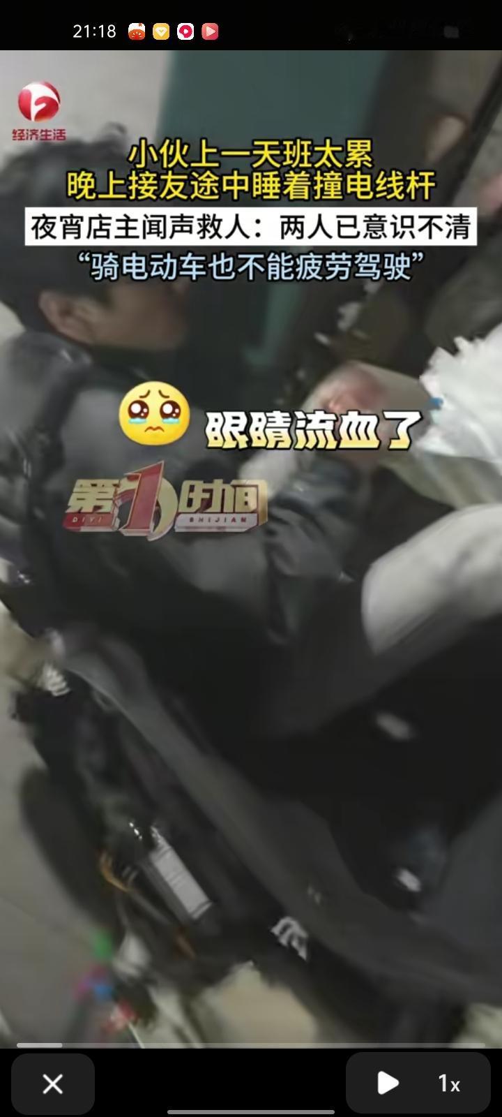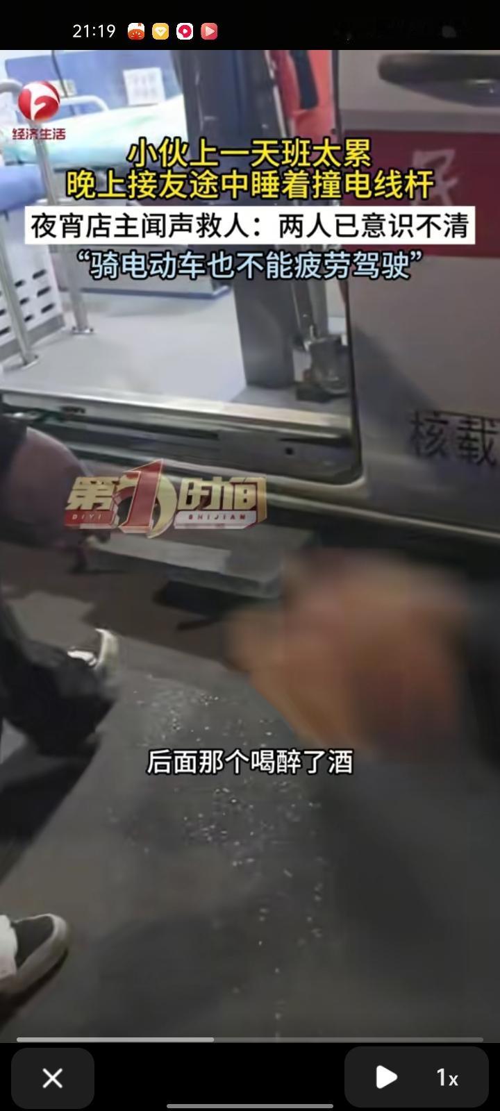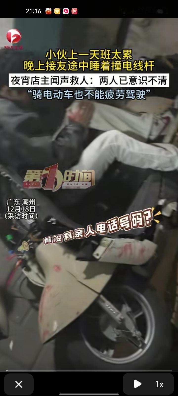 12月18日,广东潮州。网友发视频称,自己发现两个小伙骑电动车倒在地上,第一时间拨打120,急救车十分钟就赶来将他们两个带走。后面的人是喝醉了酒,前面的人上一天班太累了,骑着电动车去接他的,骑着骑着就睡着了,撞到电线杆。目前两个伤者状态挺好,提醒广大网友骑电动车不能疲劳驾驶。