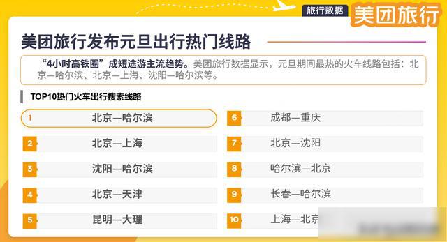 美团旅行数据显示,元旦期间最热门的火车线路多集中于“4小时高铁圈”内。北京—哈尔滨、北京—上海、成都—重庆、昆明—大理、成都—重庆、北京—沈阳、长春—哈尔滨等线路备受青睐,行程最短不足40分钟,最长约4小时。这类省时、灵活的短途出行方式,精准契合当下游客的“微度假”需求。其中,沈阳-哈尔滨、北京-沈阳,两条沈阳线路上榜了元旦十大热门火车出行线路榜。