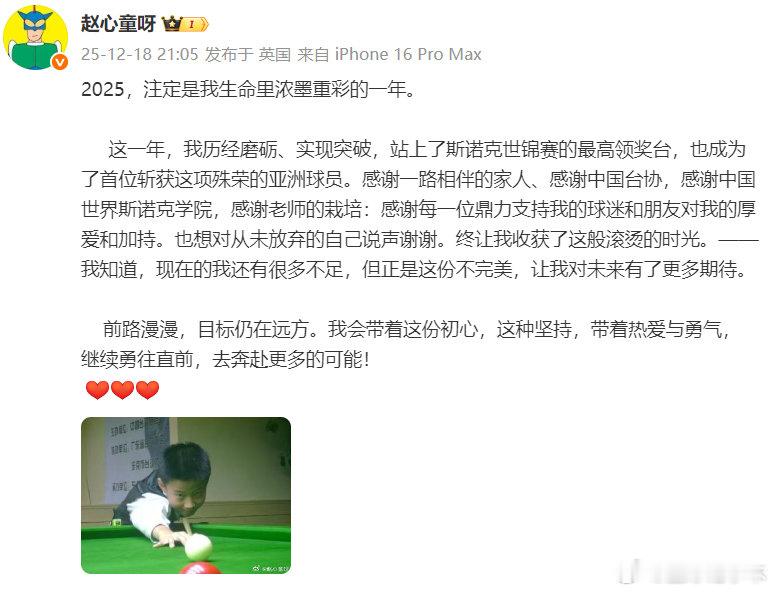 赵心童说2025浓墨重彩 2025斯诺克世锦赛,一路过关斩将登顶冠军宝座,成为首位斩获世锦赛冠军的亚洲球员!他发文感慨这一年浓墨重彩,历经磨砺终迎突破。感谢所有支持,也致敬永不放弃的自己。赵心童总结2025年