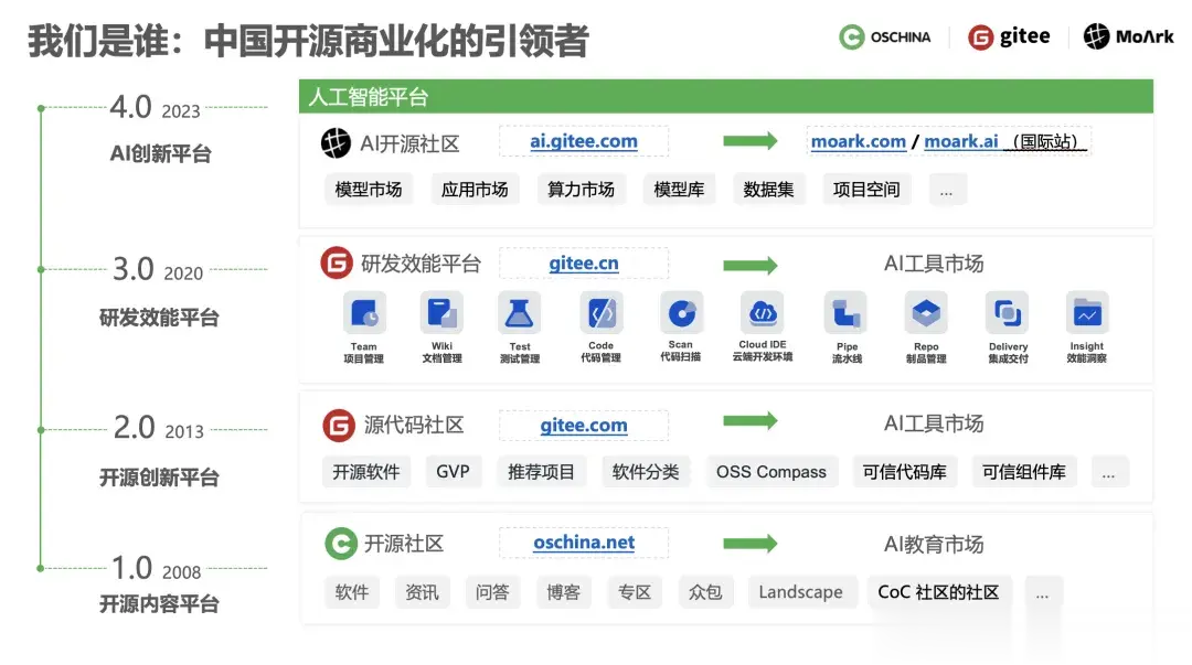 目前,开源中国有几大业务板块:开源内容社区oschina.net、开源代码托管gitee.com、研发效能平台gitee.cn、AI聚合平台moark。开源中国平台上聚集了超过1800万开发者、38万多家企业;平台累计代码托管仓库近3800万个,开源模型超17000个。