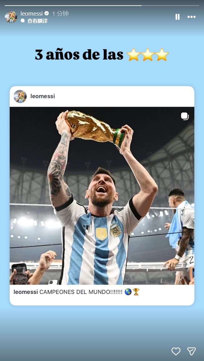 直播吧12月18日讯梅西更新社媒,他在动态中晒出了三年前的世界杯夺冠动态,并配文:三年了⭐⭐⭐。