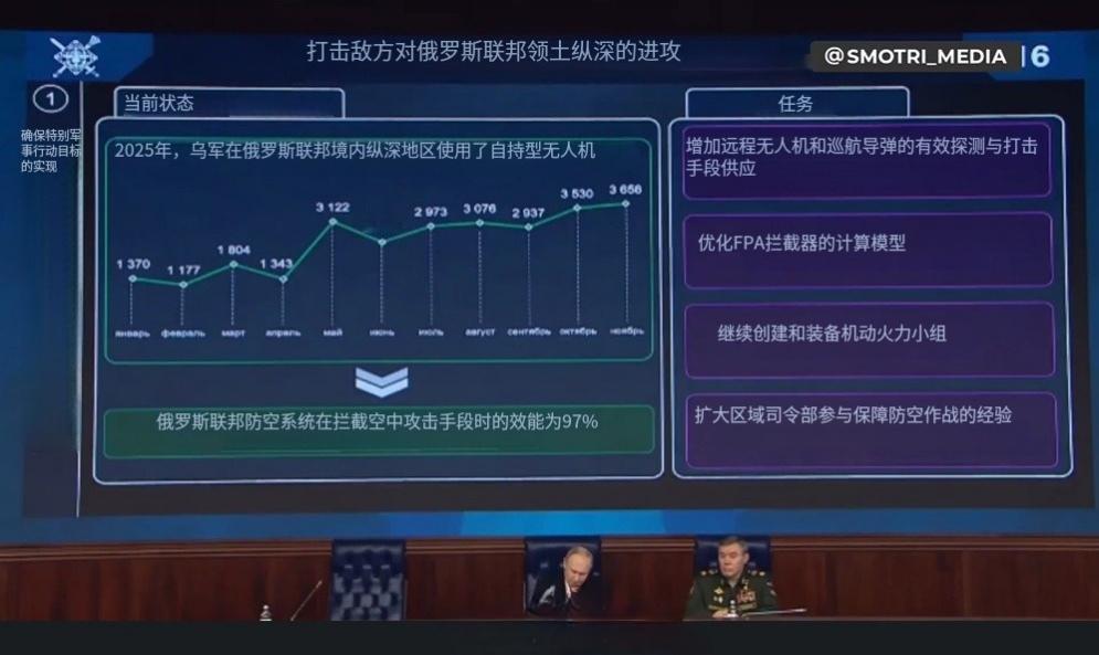 普京:“那里(欧洲)没有任何文明,只有一种全面退化” 普京在俄罗斯国防部领导会议上称欧洲的政客们都是“小猪崽”。 普京:友好的外国伙伴正在利用我们获得的特别军事行动作战经验训练他们的军队。 普京表示,如果乌克兰及其外国支持者拒绝进行实质性谈判,俄罗斯将以武力解放历史领土。 俄国防部长别洛乌索夫: “敌方在2025年初每月投入1500 架无人机(攻击俄罗斯境内),自5月起,这一数量已增至每月 3700 架。”“我方防空系统对敌方无人机的摧毁率达到 97%。” 别洛乌索夫:战略核力量是遏制对俄侵略的关键手段。 俄军同时也在加强常规力量,今年已组建5个师、13个旅、30个团;明年计划再增4个师、14个旅、39个团。