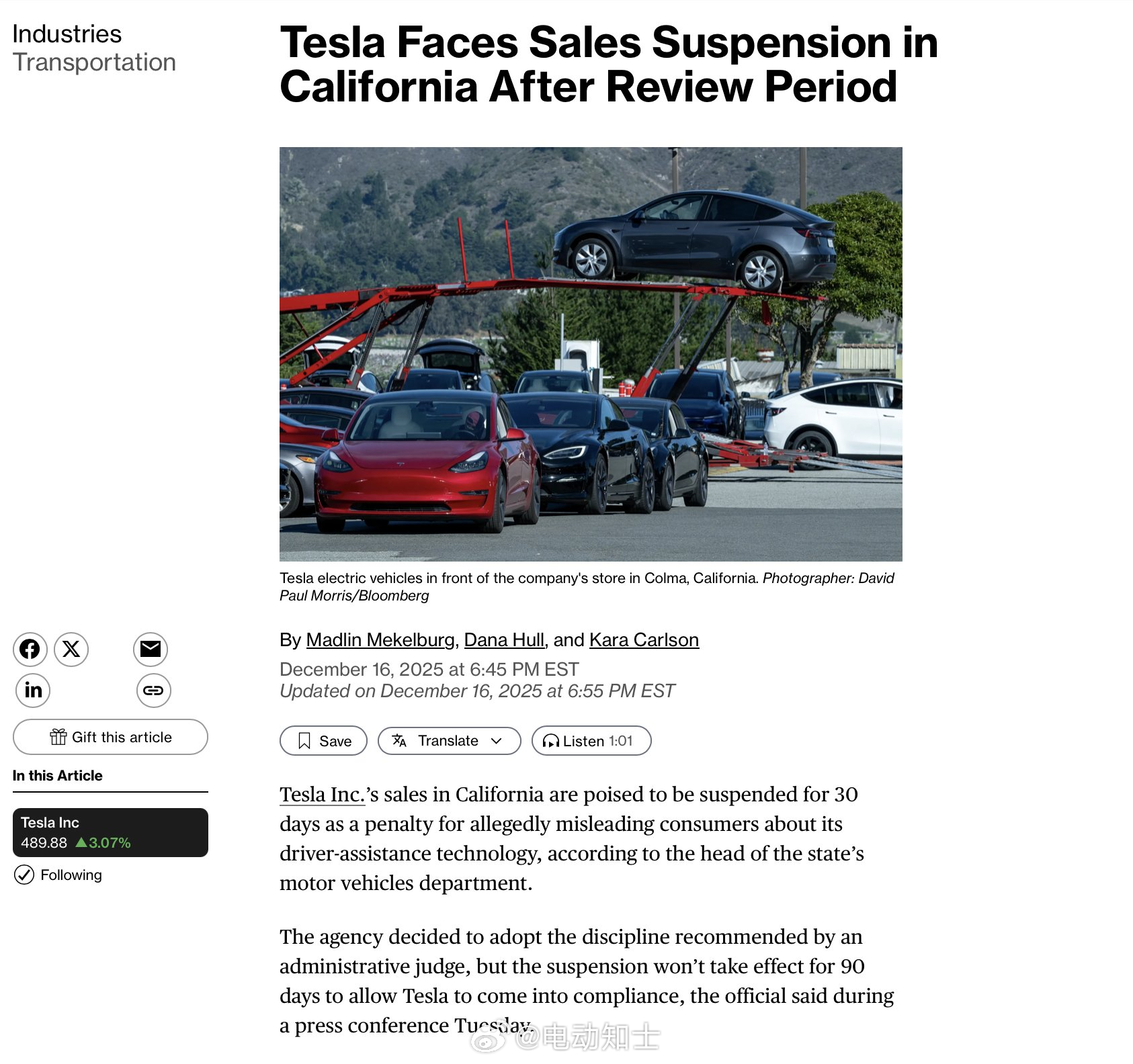 特斯拉辟谣在加利福尼亚州面临30天禁售的消息,表示特斯拉在加州的销售仍...