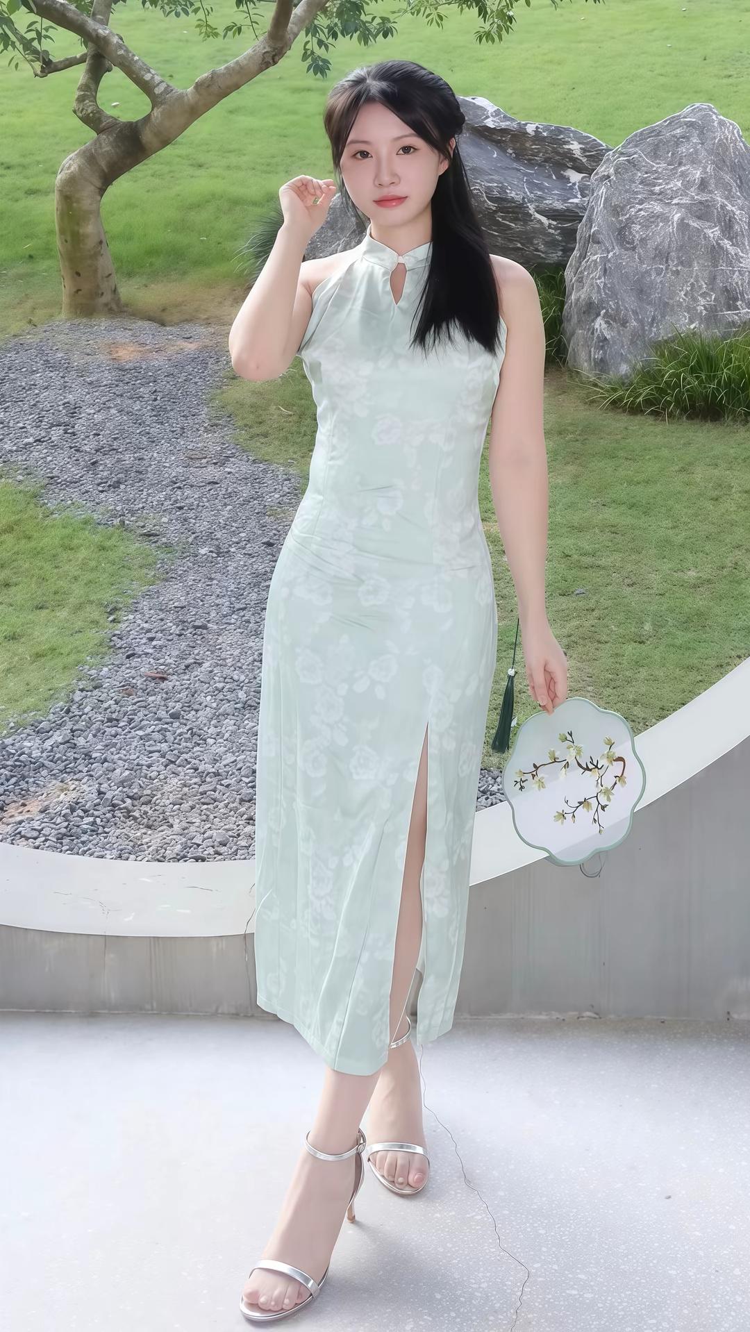 女生穿旗袍可以有多好看?《湖畔的旗袍美人》 夏日的微风轻拂过湖面,波光粼粼的水面映照着岸边的垂柳。在那青石板铺就的台阶上,坐着一位身着浅绿色旗袍的女子,仿佛是从水墨画中走出的仕女,为这宁静的午后增添了一抹动人的色彩。 她的旗袍是那种极淡的绿,像初春刚冒出的嫩芽,清新而雅致。旗袍上绣着细密的花纹,远看是简单的几何图案,近看才发现是无数朵细小的兰花,每一片花瓣都清晰可见,针脚细密,显然是出自心灵手巧的绣娘。旗袍的剪裁极为合身,完美地勾勒出她窈窕的身姿,裙摆的开叉处,隐约可见纤细的小腿,既不失端庄,又平添了几分风韵。 她乌黑的长发如瀑布般披散在肩头,发丝在阳光下泛着健康的光泽。她没有过多的装饰,只在发间别了一支简单的玉簪,那玉簪是上好的和田玉,温润通透,与她恬静的气质相得益彰。她手中拿着一把团扇,扇面上绘着几枝墨竹,扇柄上垂着红色的流苏,随着她的动作轻轻摇曳,仿佛在诉说着一个古老的故事。 她静静地坐在那里,双腿优雅地交叠,一只手自然地放在膝盖上,另一只手轻摇着团扇。她的目光望向远处的湖面,眼神温柔而深邃,仿佛在回忆着什么,又仿佛在憧憬着什么。她的姿态是那样的从容,那样的优雅,仿佛时间在她身边都放慢了脚步。 远处的湖水在阳光下泛着金色的光芒,几只水鸟在湖面上嬉戏,偶尔发出清脆的鸣叫。岸边的垂柳在微风中轻轻摆动,柳条拂过水面,荡起一圈圈涟漪。这一切都像是为她精心布置的背景,而她,就是这幅画中最动人的主角。 她脚上的那双银色细带高跟鞋,在阳光下闪着微光,与她旗袍的颜色形成了巧妙的呼应。鞋跟细而高,却丝毫没有影响她的优雅姿态,反而让她显得更加亭亭玉立。她的脚踝纤细而白皙,与银色的鞋带形成了鲜明的对比,更添几分妩媚。 这位旗袍美人,就像是从时光深处走来的古典佳人,她的美,不仅仅是外表的精致,更是一种从内而外散发出的气质。她的优雅,她的从容,她的恬静,都让人为之倾倒。她坐在那里,就像一首无言的诗,一幅流动的画,让人沉醉其中,久久不愿移开目光。 湖风轻轻吹过,带来了丝丝凉意,也带来了远处荷花的清香。她微微侧头,发丝随风轻扬,嘴角泛起一丝若有若无的笑意。这一刻,时间仿佛静止了,整个世界都沉浸在她的美丽之中。这位旗袍美人,用她的美,诠释了什么是真正的东方韵味,什么是永恒的优雅。