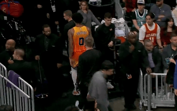 比赛的第二节,迈尔斯-布里奇斯二次起跳落地崴脚,目前已返回更衣室。