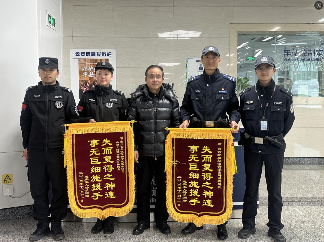 民辅警调取沿线监控细致排查,经近一小时紧张搜寻,最终在黔春路站锁定遗失背包。民警全程陪同老人取回失物。紧握失而复得的助听器,老人哽咽致谢:“没有它,我的世界就没有声音。”