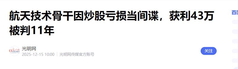 一波未平,一波又再起!前脚军工领域刚揪出刘卫东这只“大老虎”,后脚航天圈就曝出个“糊涂虫”,一位技术骨干为了补炒股亏空,把涉密文件当“筹码”换了43万,结果直接被判了十一年! 最近,两起通报引发了外界的高度关注,一是航天技术骨干陈某某因泄密被判刑,另一是中国兵器装备集团原副总经理刘卫东落马。 这两起案件,一个关乎“出卖”,一个关乎“腐败”,却指向了国家安全的内部防线。 陈某某在一家核心科研单位工作了多年,手里掌握着大量尖端技术资料。早在十多年前,他就已经和境外间谍机构有过接触,但他当时选择了隐瞒。 直到2018年,陈某某因为炒股亏损,欠下了几十万的债,这笔经济压力让他彻底丧失了基本的职业底线和政治觉悟。 为了还债,他在三年的时间里多次向境外提供机密,累计换取了43万多元。这笔钱看起来不少,但他出卖的却是月球探测、空间站建设等核心技术数据。 这些资料是无数科研人员几十年没日没夜攒下的家底,一旦外泄,国家的战略布局就会受到难以挽回的损失。 法律的惩处非常果断,陈某某最终被判处有期徒刑十一年,剥夺政治权利四年,所有的非法所得全部追缴。 对于一个原本有着大好前途的科研骨干来说,用十一年的自由换取43万的“快钱”,这笔账怎么算都是输。 这也提醒了所有涉密人员,个人的财务困境在国家安全面前,连一粒沙子都算不上,法律绝不会为贪欲开绿灯。 刘卫东的情况代表了另一种层面的风险,他在大型军工企业身居高位,掌管着资源分配和人才选拔。他利用职务便利,在企业经营和干部任用中搞权钱交易。 军工系统一旦出现权力套现,后果往往是连锁反应。原本该投入研发的资金可能被挪用,有真才实学的人才可能被排挤,甚至连武器装备的质量,都可能因为利益交换而打折扣。 因此,清理这些岗位上的害群之马,是维护安全最直接的手段。 航天和武器研发是国家的硬支撑,在这个领域,职业荣誉和纪律必须排在首位。现在国际竞争日趋激烈,外空安全关乎每一个人的安稳生活。 这些案件的密集曝光,说明监管部门正在加大力度清理内部环境,绝不给任何投机分子留下生存空间。 陈某某丢掉了名声和前途,换来的是漫长的牢狱生活。而像刘卫东这样的腐败分子,也终究逃不过清算。 只有确保关键技术和核心权力掌握在忠诚的人手中,我们的研发环境才能干净,老百姓的心里才能踏实。 信息来源:《航天技术骨干因炒股亏损当间谍,获利43万被判11年》,光明网,2025年12月15日。