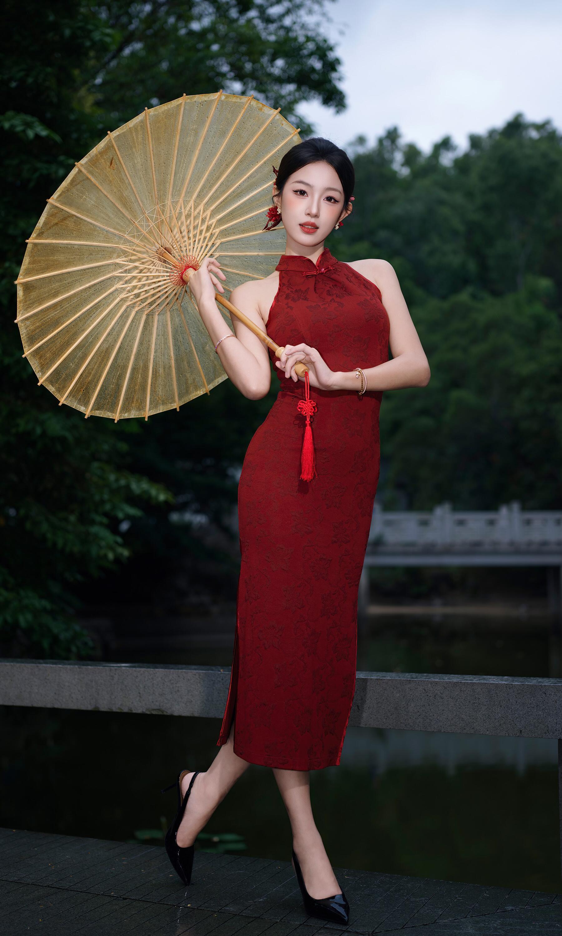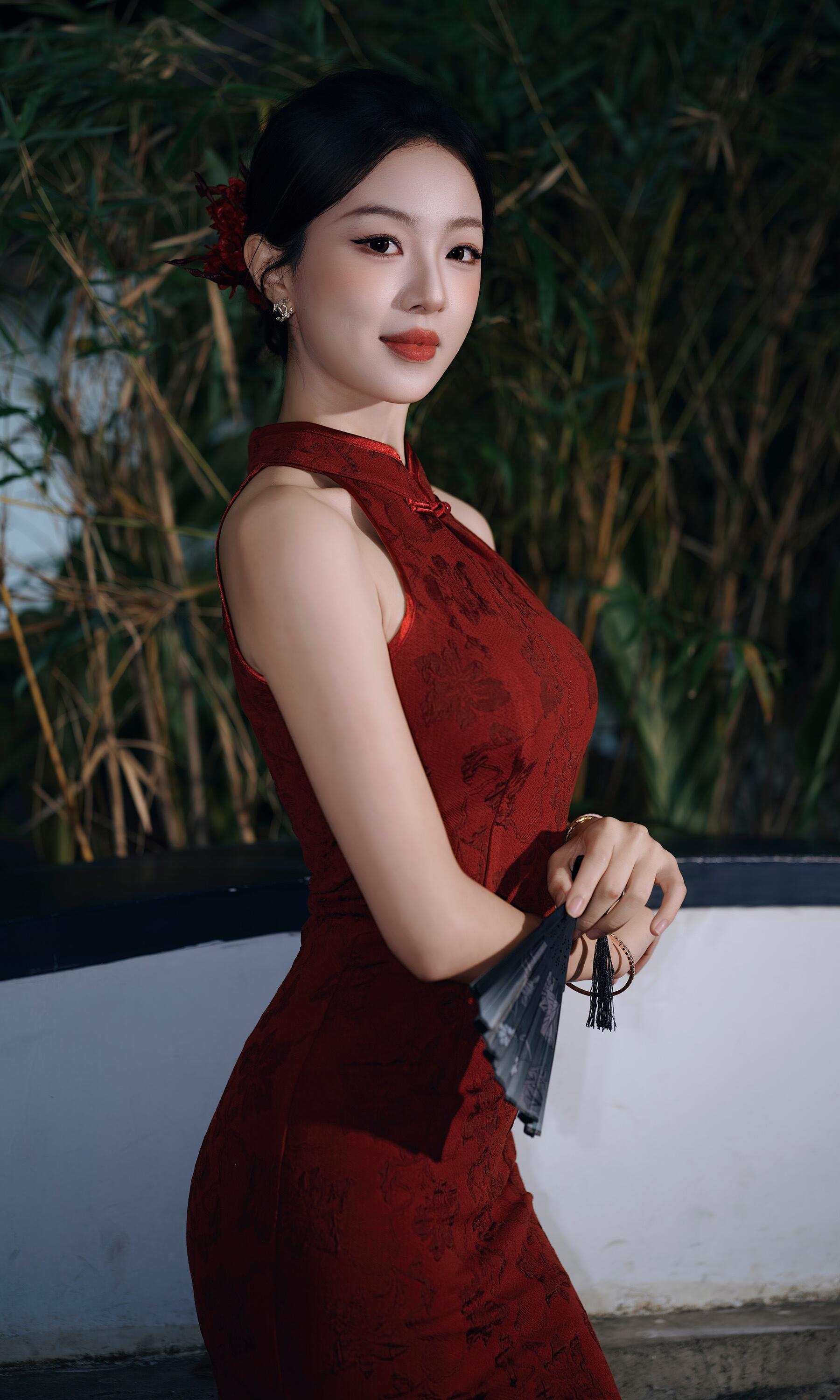 烟紫色提花无袖旗袍太戳人,利落裁剪勾勒出东方身段的柔美。这位美女的旗袍穿搭堪
