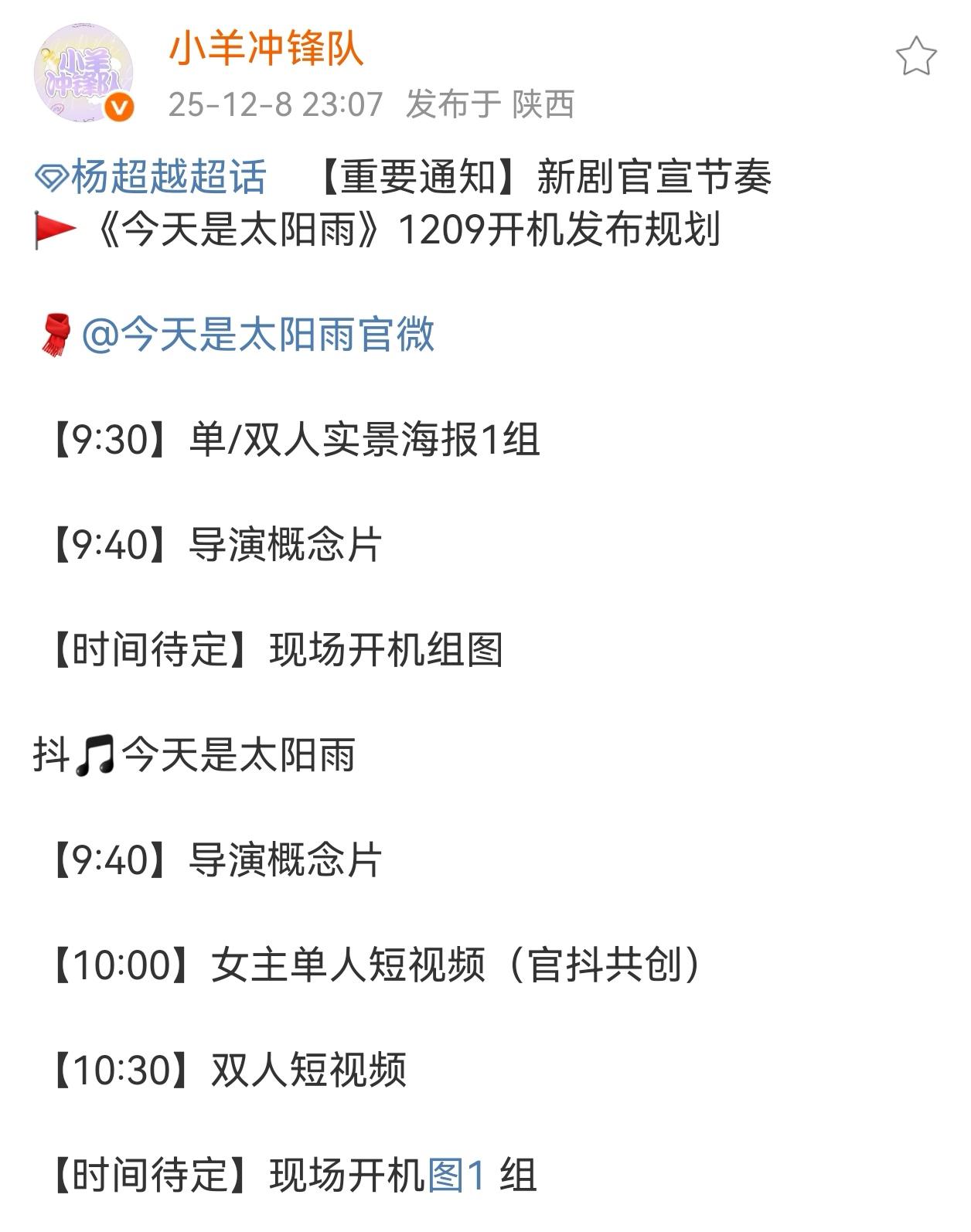 杨超越粉丝!!!【重要通知】新剧官宣节奏 🚩《今天是太阳雨》1209开机发布规划 🧣 【9:30】单/双人实景海报1组 【9:40】导演概念片 【时间待定】现场开机组图 抖🎵今天是太阳雨 【9:40】导演概念片 【10:00】女主单人短视频(官抖共创) 【10:30】双人短视频 【时间待定】现场开机图1组 ‼️所有以官方发布为准 杨超越杨超越郑雨杨超越今天是太阳雨今天是太阳雨开机
